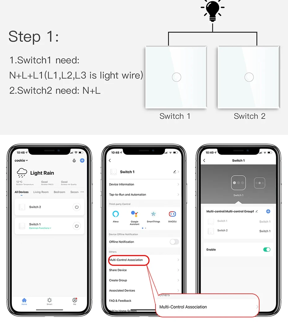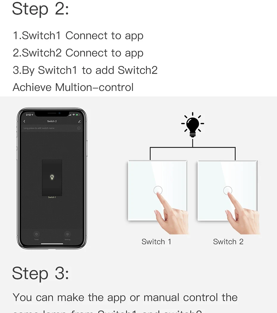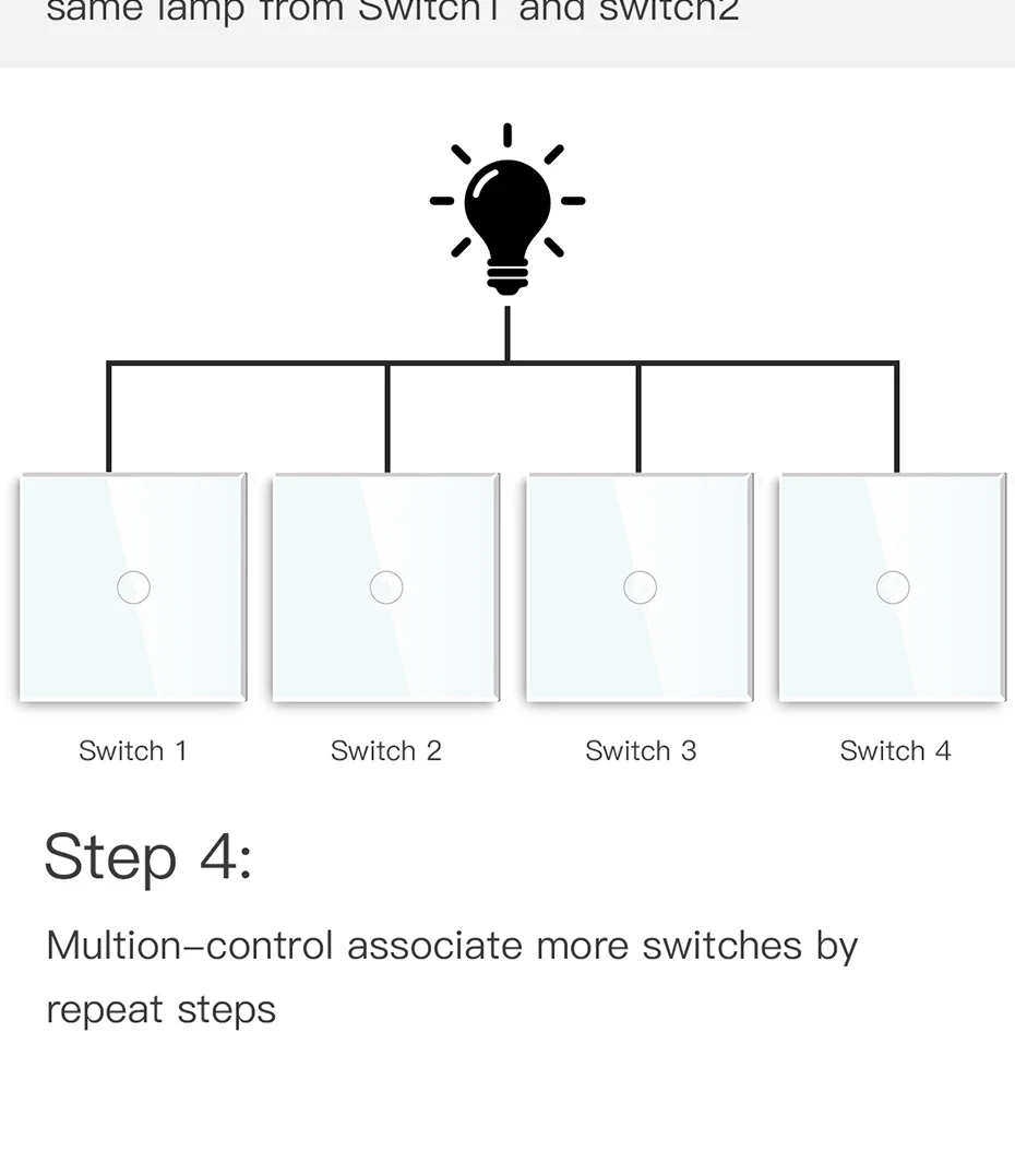 R:Wifi Switch solo puede funcionar con un interruptor wifi para controlar la misma luz, por lo que debe comprar al menos 2 unidades. El máximo de control múltiple es de 4 vías.