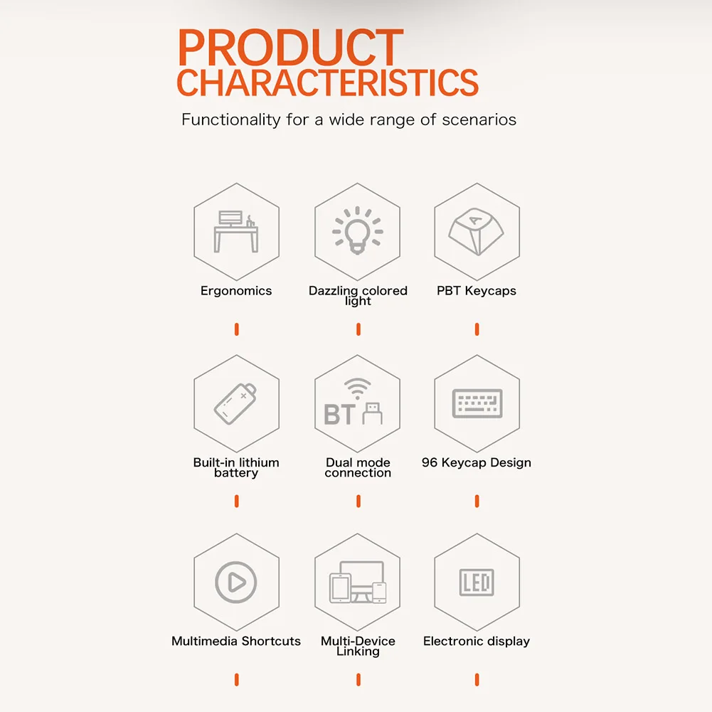 Especificación:Origen: China continentalTipo: inalámbrico Compatible con BluetoothAplicación: Escritorio, computadora portátil, tabletaEstándar de teclado: 94 teclasIdioma: inglésEstilo de operación: MEMBRANATipo de interfaz: Compatible con BluetoothEstilo: Mini, MultimediaPaquete: SíTipo de retroiluminación: MULTICOLORMaterial del teclado: plástico PBTNúmero de llaves: 96
