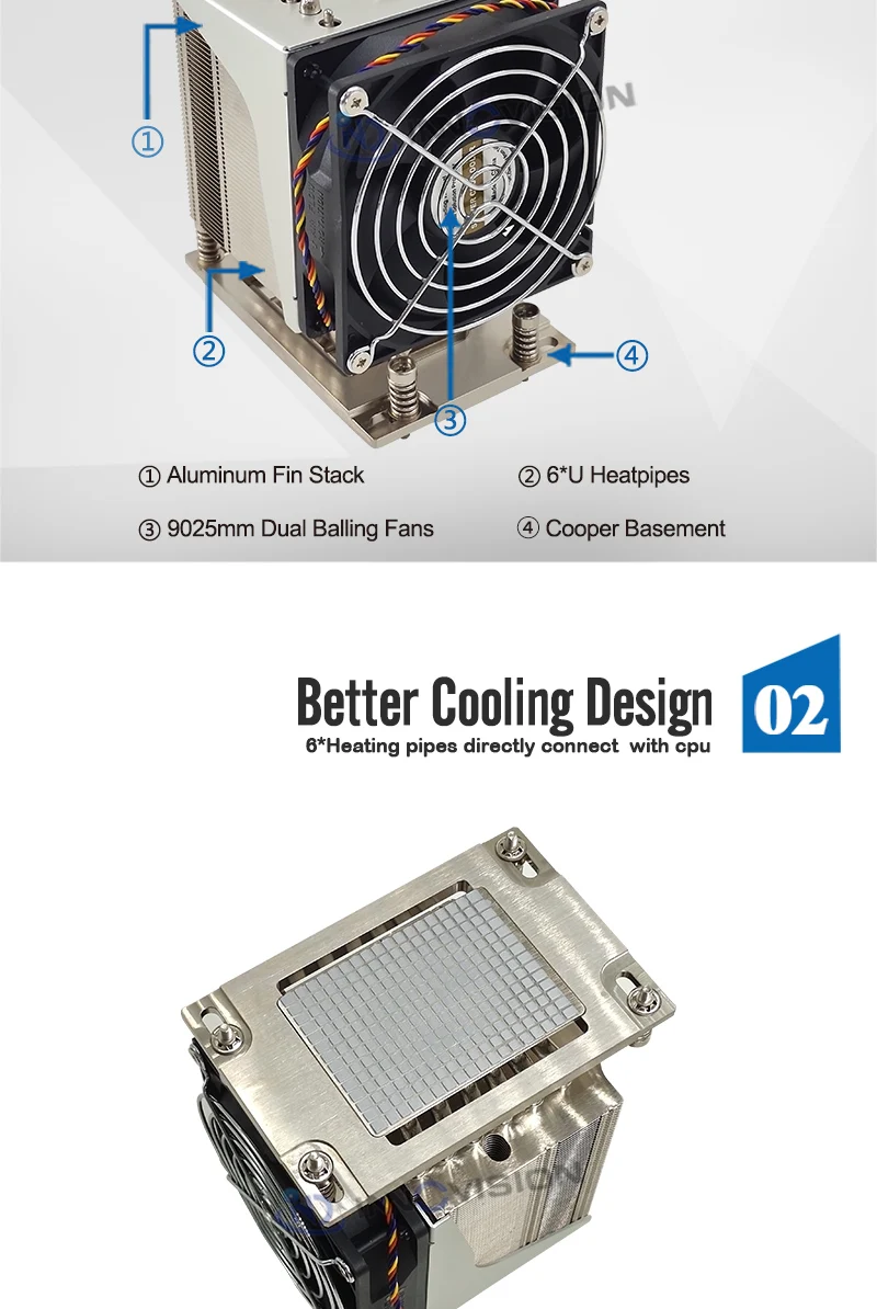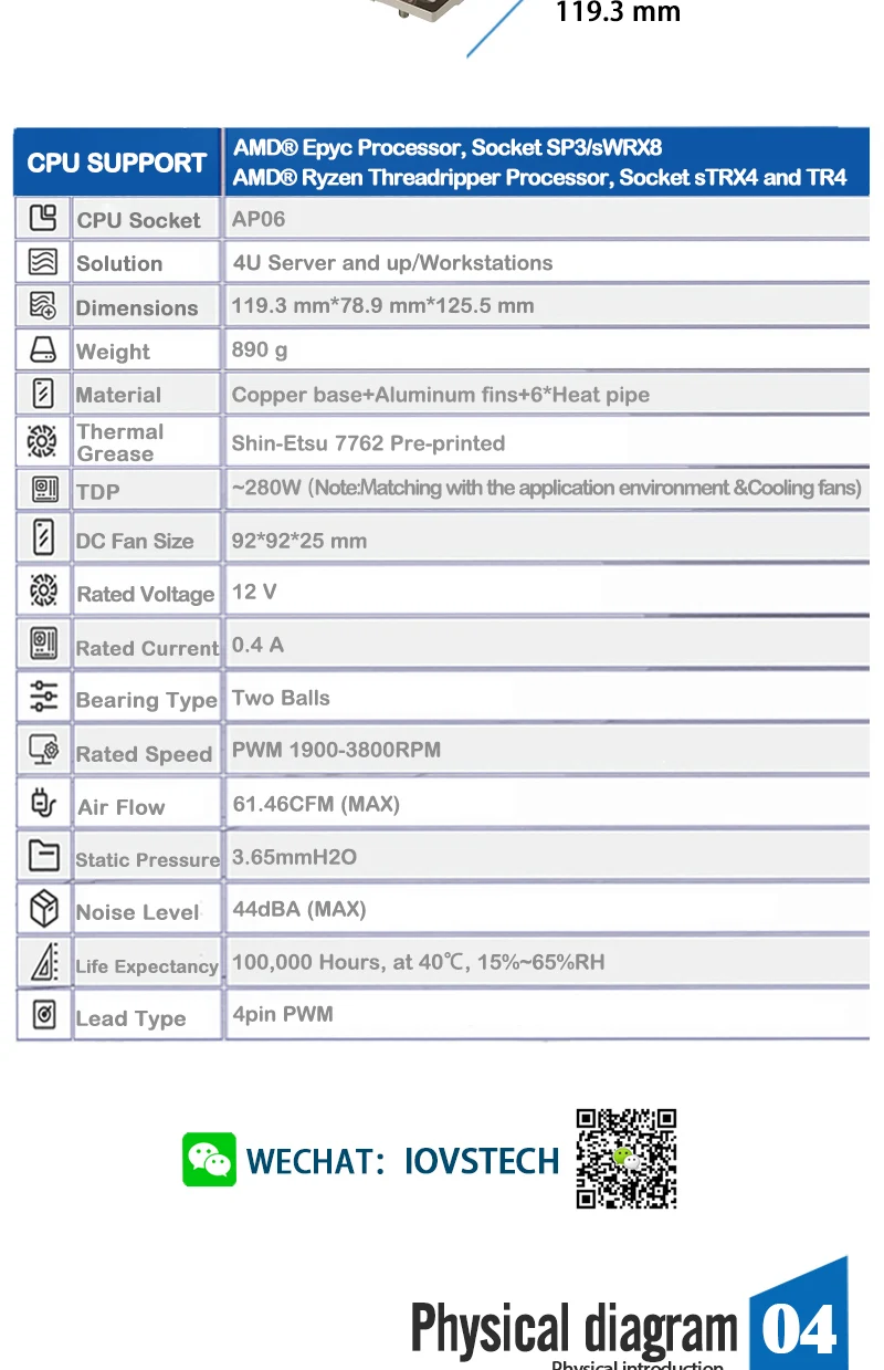 Descripción del productoAP06 es un disipador térmico de CPU activo de alto rendimiento, para AMD® Procesador Epyc, Socket SP3/sWRX8 y AMD® Procesador Ryzen Threadripper, zócalo sTRX4 y TR4. Con un ventilador PWM de 90x25 mm de bajo ruido, 6 * H.C.C especial.(CPU de contacto con tubos térmicos) Enfriador de CPU con tecnología HeatPipe para 4U y posteriores y estación de trabajo. El TDP hasta una potencia de CPU de 280 vatios.