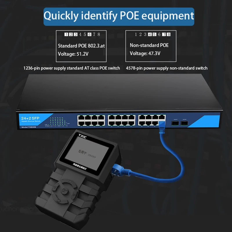 5: Identificación POE: use el cable de red para conectar el dispositivo POE al host, puede identificar expresamente si el dispositivo es un dispositivo POE estándar y mostrar parámetros como la cantidad de núcleos de fuente de alimentación, voltaje y estándares de equipos.