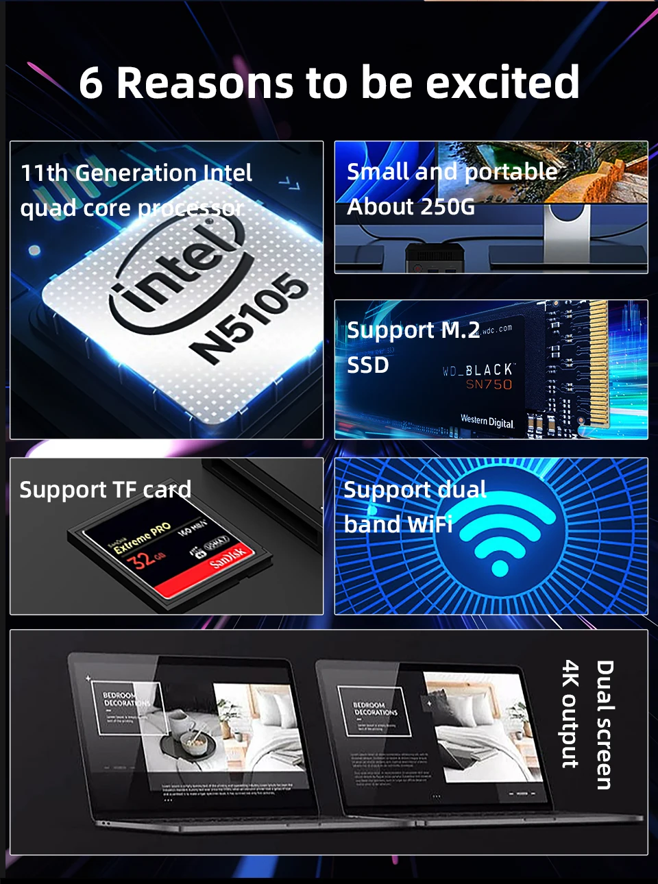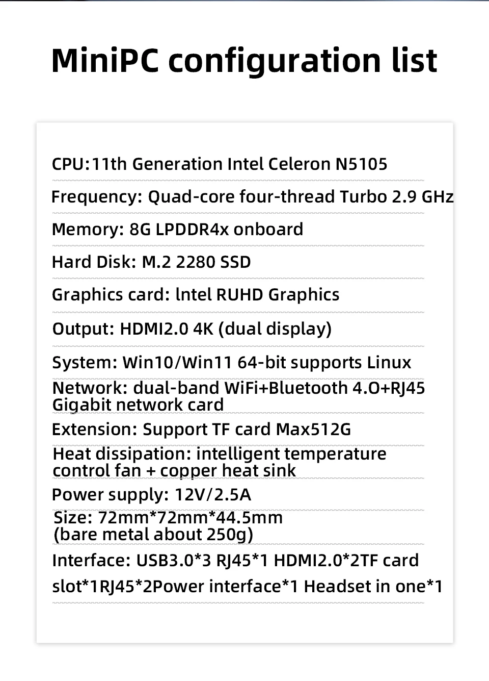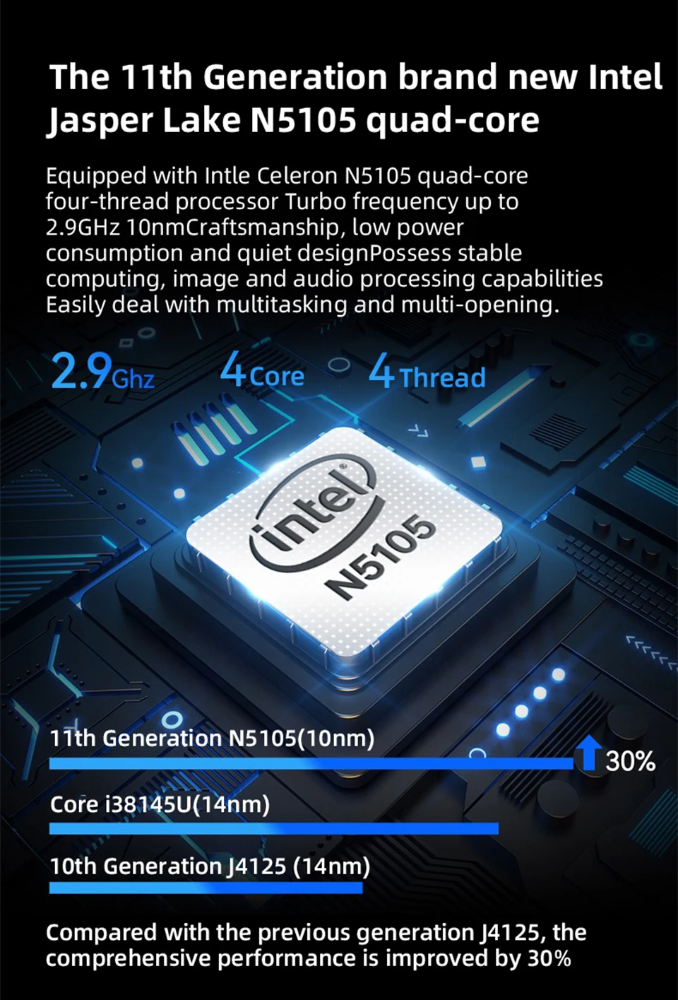 [La mini pc más pequeña que puedas imaginar]:BY50 Minicomputador Intel Celeron Jasper Lake N5105 de 11.83*2.83*1.75 pulgadas 0,45 libras con carcasa inteligente L3 de 10 nm, 4 núcleos, 4 hilos, 2,0G-2,9G TDP, 10W y 4 MB.El N5105 tiene un 40 % más de rendimiento que el J4125/J3455/N5095/N5100.