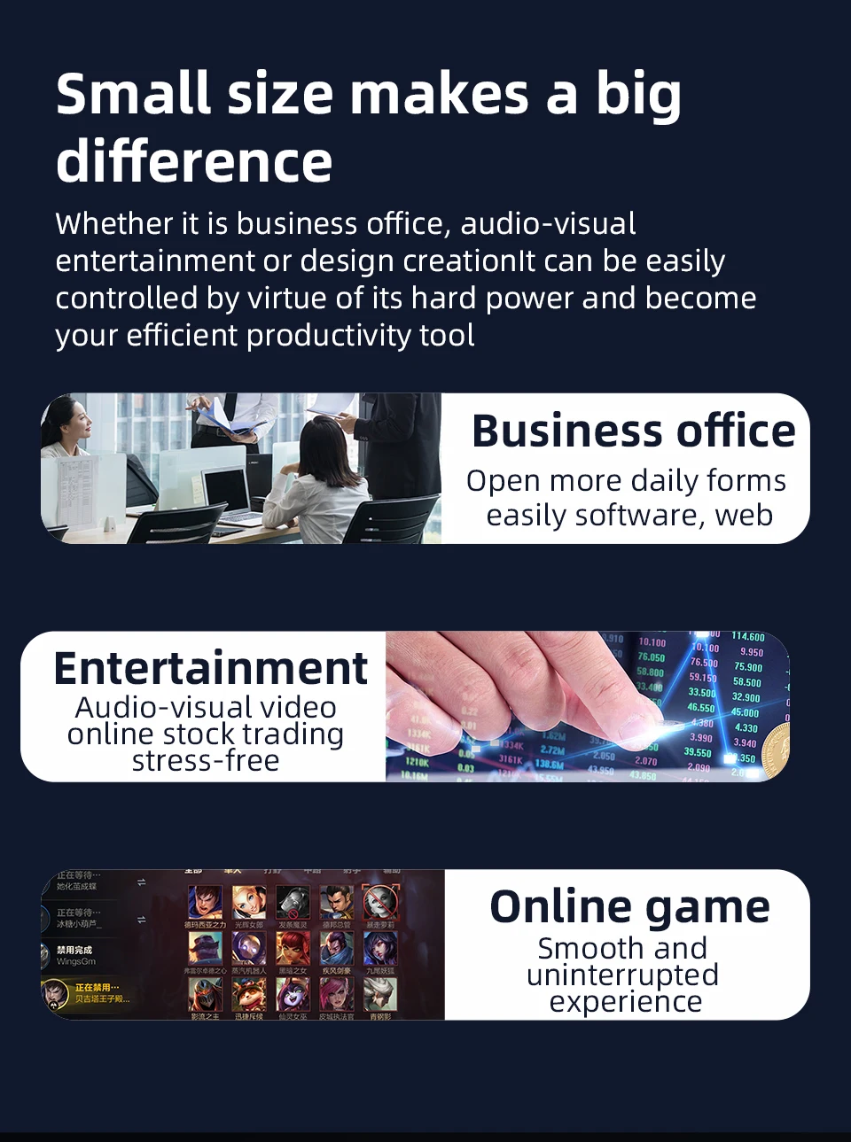 [Gráficos 4K UHD inmersivos]:Computadora micro pc BY50 con HDMI 2.0 *2 (4096x2160@60Hz) admite monitores duales para máxima productividad en su flujo de trabajo y muestra imágenes 4K UHD ultrarrealistas con una claridad increíble.La mini computadora BY50 es el compañero perfecto para navegar por Internet, negociar existencias y trabajar al mismo tiempo.