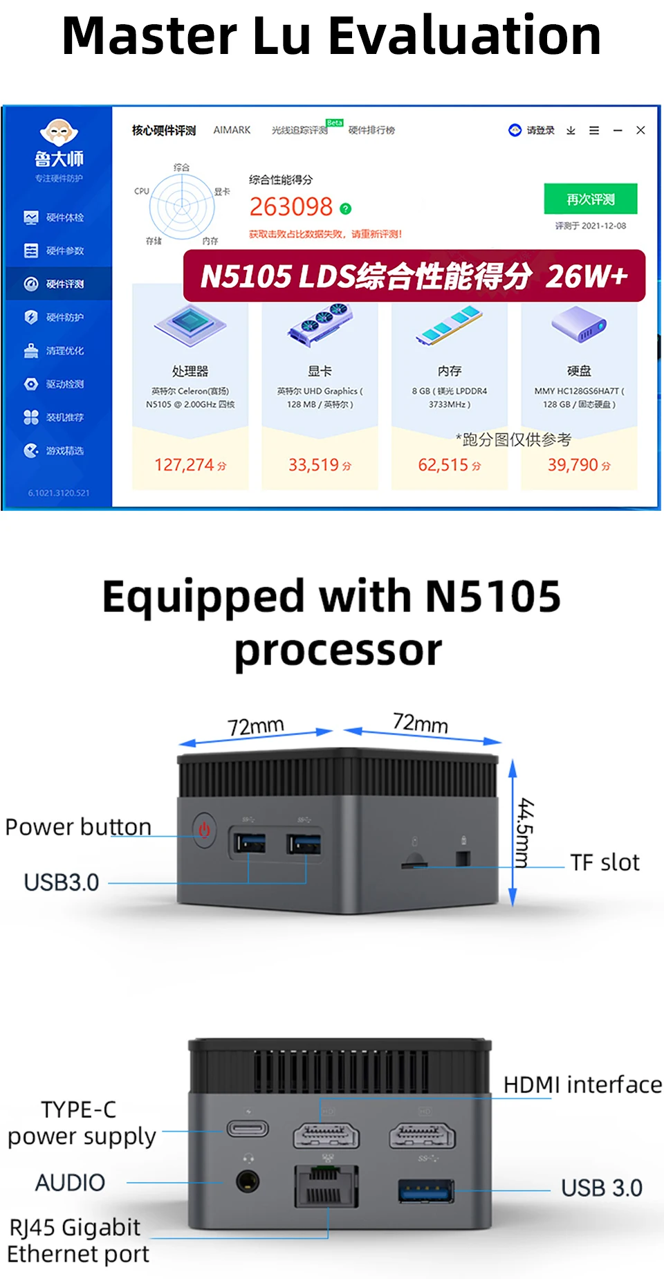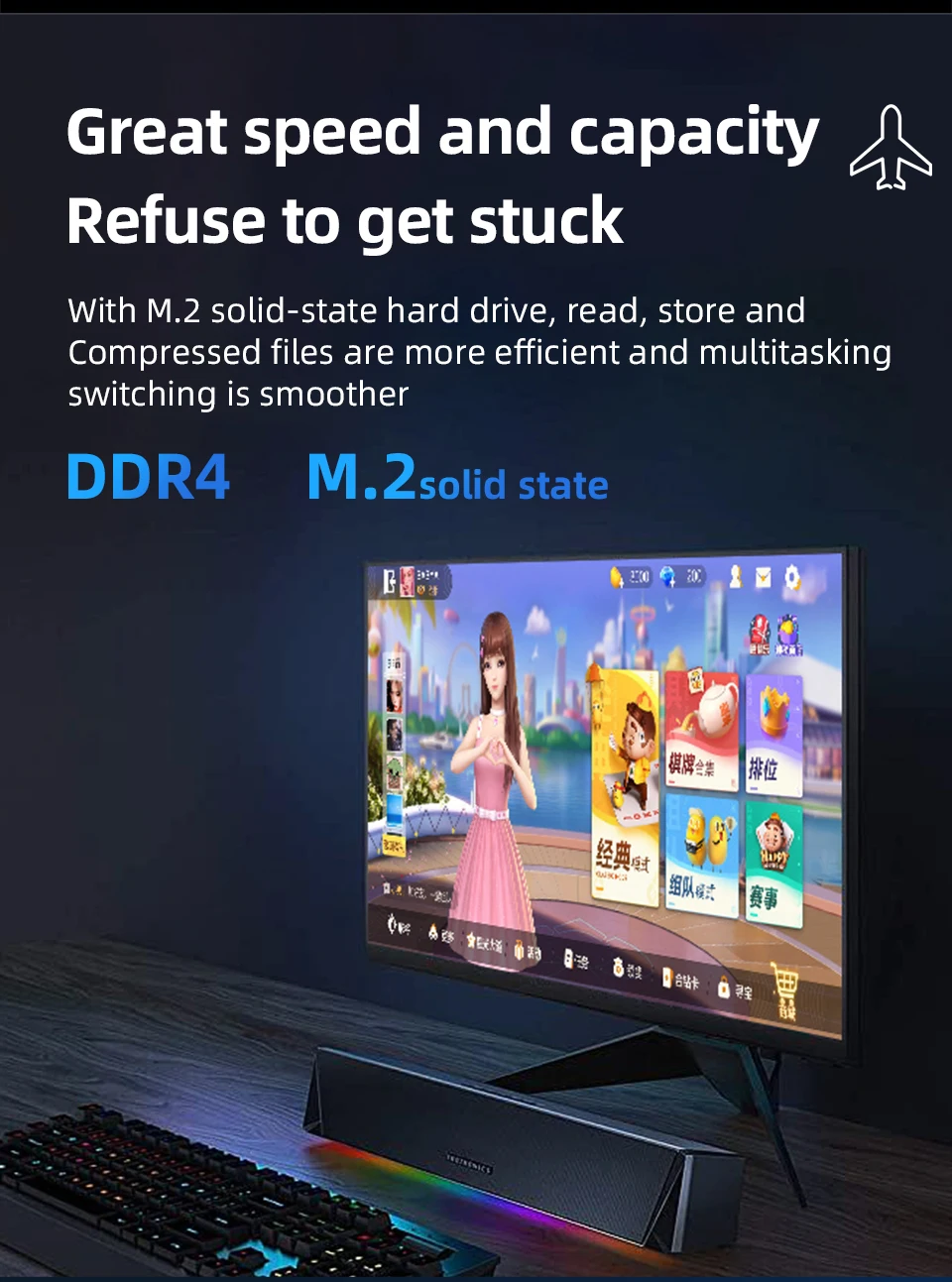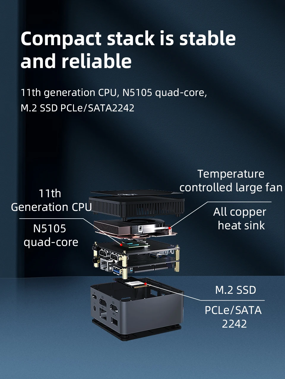 [8 GB de RAM + 256 GB NVME SSD]:Mini PC de escritorio BY50 N1 con LPDDR4 de doble canal de 8 GB de RAM, la velocidad máxima de funcionamiento de la mini torre es de hasta 2933 MB/s con SSD NVME de 256 GB.