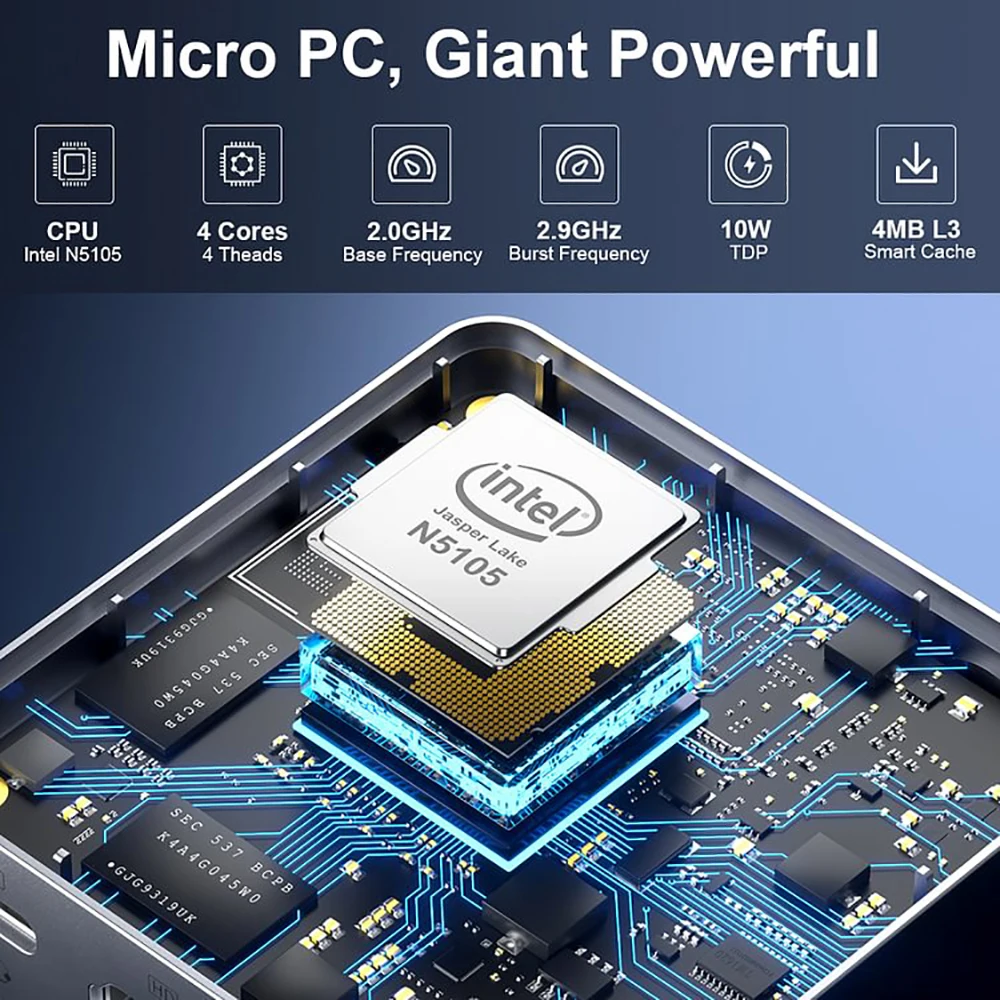 [La mini pc más pequeña que puedas imaginar]:BY50 Minicomputador Intel Celeron Jasper Lake N5105 de 11.83*2.83*1.75 pulgadas 0,45 libras con carcasa inteligente L3 de 10 nm, 4 núcleos, 4 hilos, 2,0G-2,9G TDP, 10W y 4 MB.El N5105 tiene un 40 % más de rendimiento que el J4125/J3455/N5095/N5100.