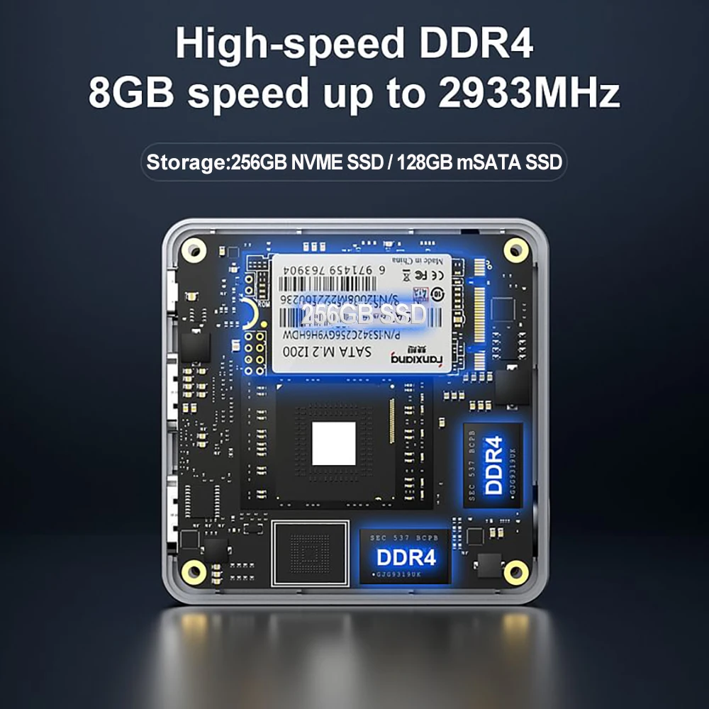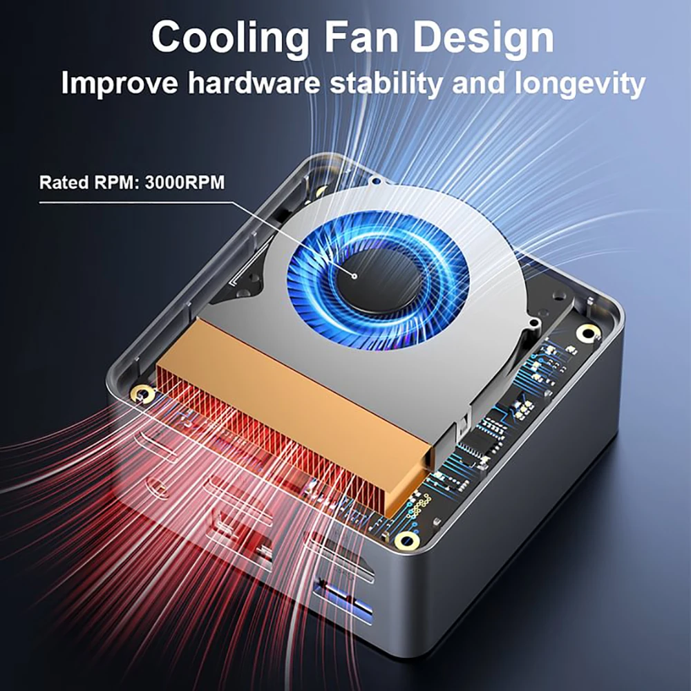 [8 GB de RAM + 256 GB NVME SSD]:Mini PC de escritorio BY50 N1 con LPDDR4 de doble canal de 8 GB de RAM, la velocidad máxima de funcionamiento de la mini torre es de hasta 2933 MB/s con SSD NVME de 256 GB.
