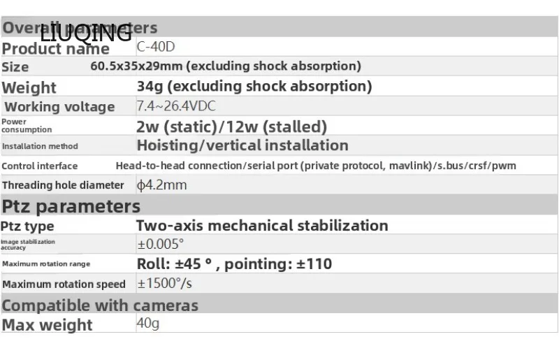 - The C-40D 2-axis Gimbal is compatible with a payload device no heavier then 40g. With a 2-axis mechanical stabilization structure and