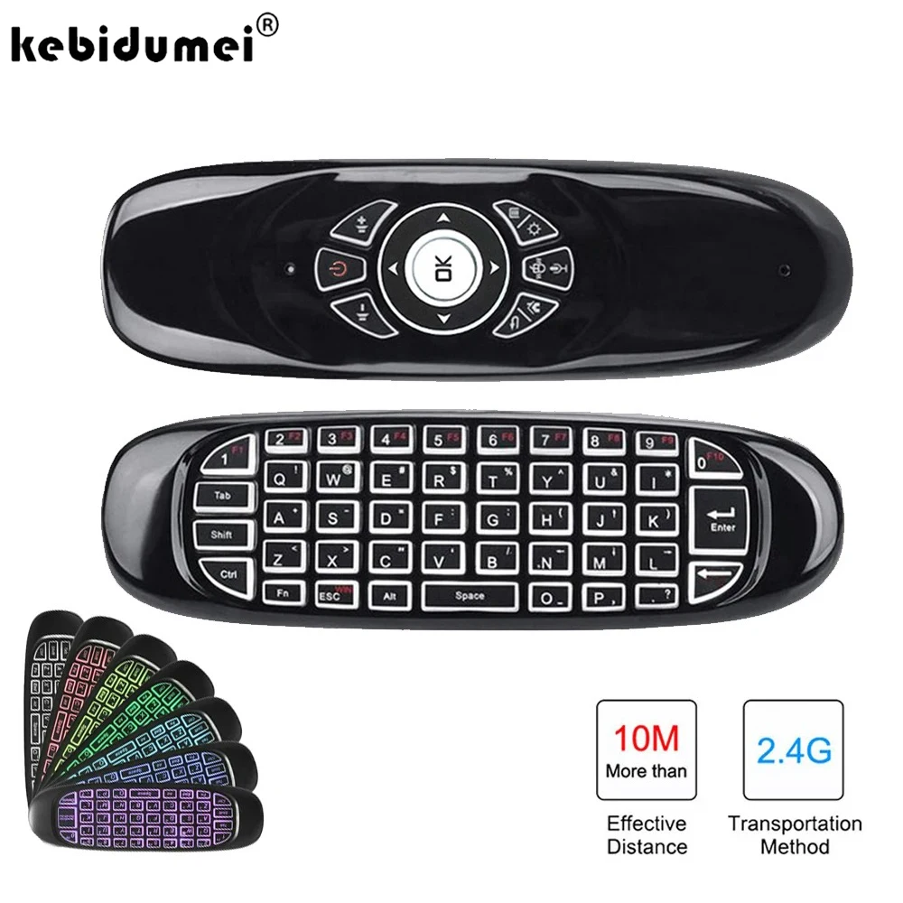 Comprar C120 RGB 7 retroiluminación Fly Air Mouse Sensor giroscópico inalámbrico 2,4G RF teclado Control remoto para juegos Android Smart TV Box