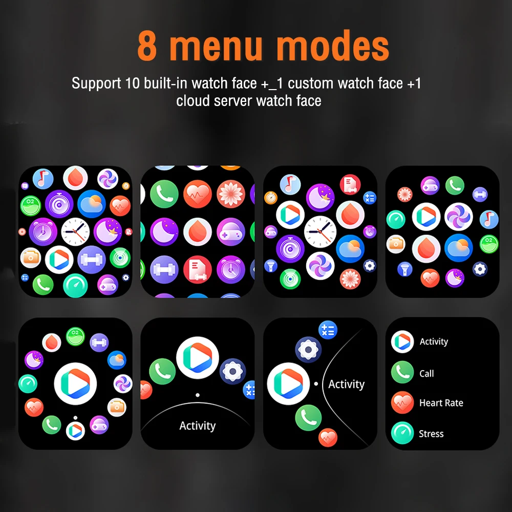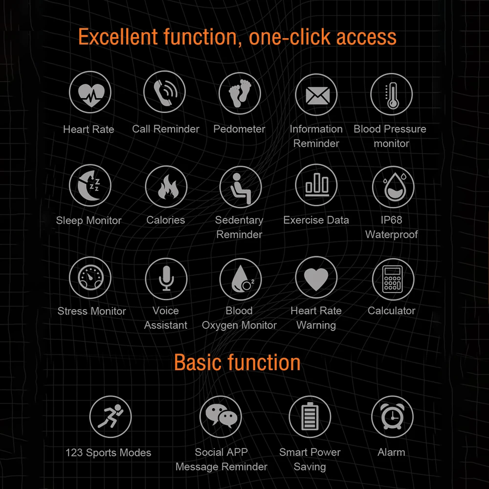 12. Funciones básicas: marcación, contactos comunes, registros de llamadas, pasos, sueño, frecuencia cardíaca, ejercicio, presión arterial, clima, control de cámara, oxígeno en sangre, control de música, cronómetro, despertador, temporizador, recordatorio sedentario, entrenamiento de respiración, calculadora, Mensaje, ajuste de brillo, silencio, código QR, Centro rápido, búsqueda de teléfono móvil, advertencia de frecuencia cardíaca, asistente de voz, monitor de presión, tendencia dinámica de frecuencia cardíaca y análisis de datos durante todo el día.