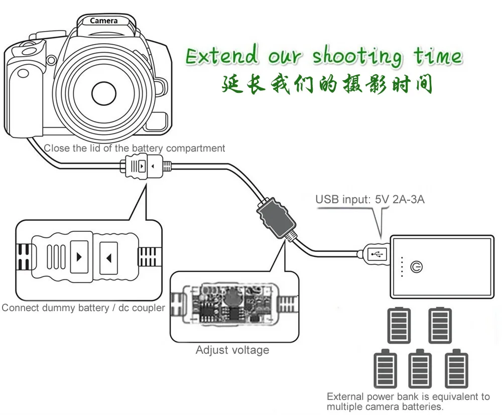 Features:Input:5V 2A-3AOutput:4.3V 1.5AConversion efficiency:92% (DC-DC Efficient conversion rate)USB plug Specifications: USB2.0length:105-120cm Descriptions:1.DC drive cable can not only play the role of power adapter, while also serving to effectively suppress harmonic current noise.2.DC-DC converter , high conversion efficiency,output quiescent current is small.3.More safe and efficient buck circuit design.4.DC drive cable connected power bank supply for digital cameras, power bank capacity: 8000-30000mAh, equal to the new battery in the camera's power many times;When you turn on the flash to take pictures or video, to provide uninterrupted power supply.5.Provide adequate power for the camera, is Wedding with the film, outdoor photography, video filming, travel and other best tool.Note:1.In order to make your camera work better, please use a high-quality mobile power, the power bank output is stable.2.Do not use the computer USB supply for the camera,because most computer USB 2.0 output voltage is 5V,But the current is less than 500mA. Some mobile phone / tablet usb charger with identification resistance, can not identify the camera, the current can not meet the requirements, it is not recommended.3.From March 28, 2018, we configured the goods with a new version of the USB cable.