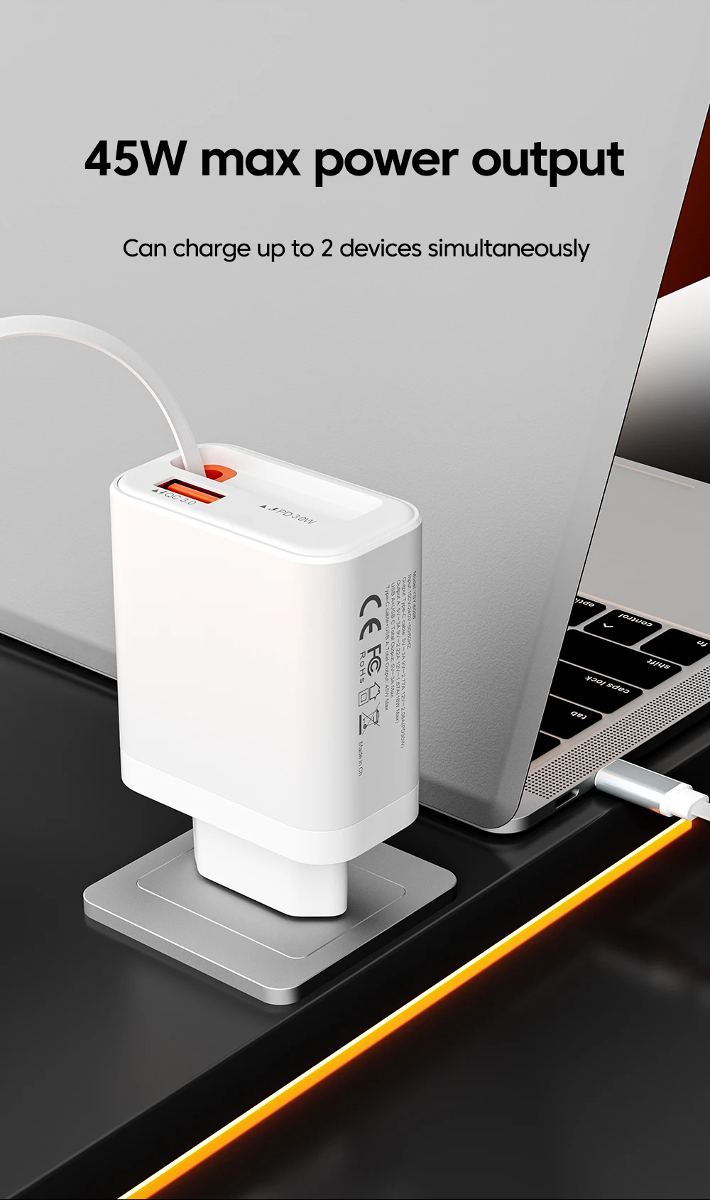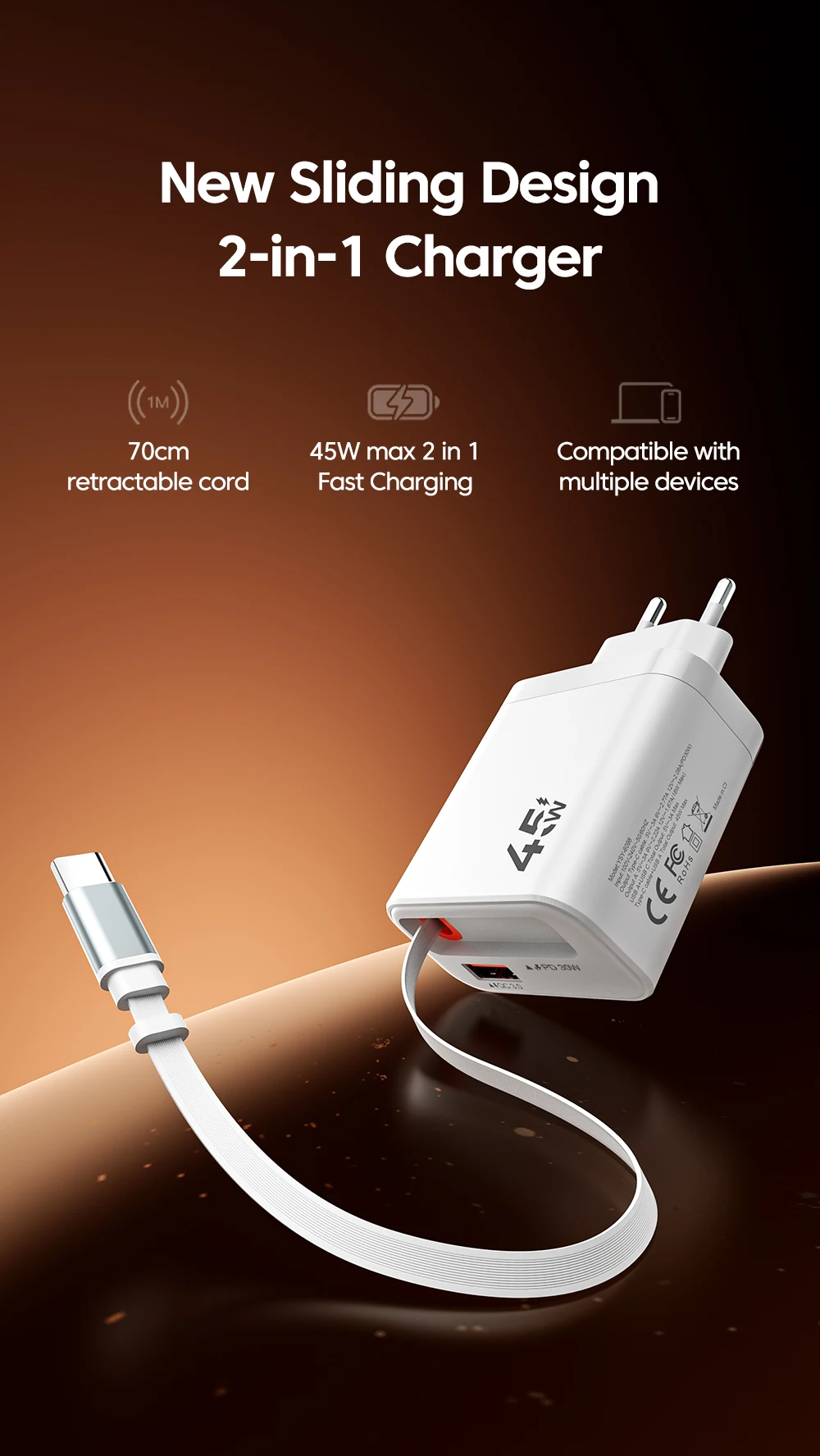 Cabezal de carga PD USB-C de 45W, cargador rápido para teléfono móvil con Cable de datos retráctil tipo c para tableta Samsung Huawei iPhone15/16/17