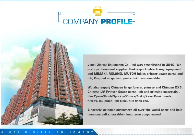 Somos un proveedor profesional que exporta equipos publicitarios: impresoras de inyección de tinta MIMAKI, ROLAND, MUTOH y repuestos para impresoras: varios cabezales de impresión, amortiguadores, pliegue principal, tapa superior, cables, bomba de tinta, estación taponadora, placa dedia, limpiaparabrisas, motor, control deslizante, sensor codificador, escala codificadora, placa principal, placa deslizante, fuente de alimentación, polea en Y, correa, tubos de tinta, chips de tinta permanentes, sistema Bulk de tinta, papel de limpieza