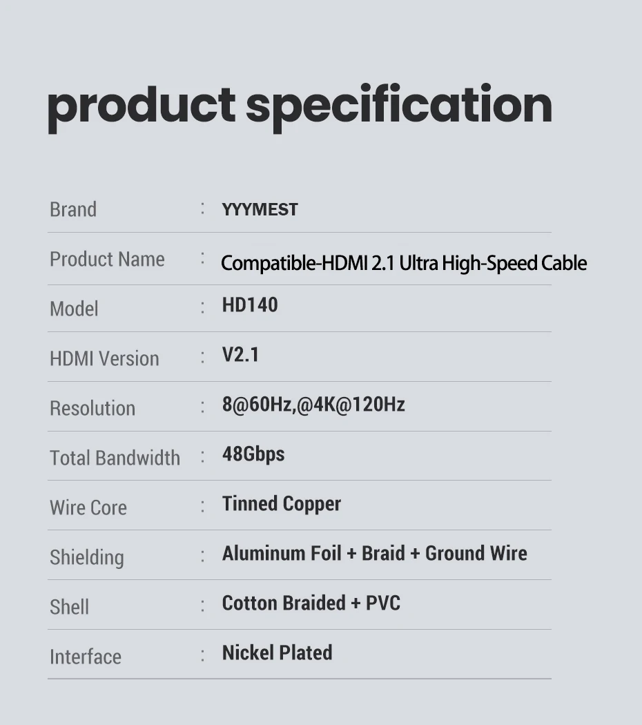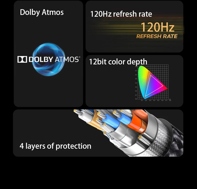 Compatible con HDMILos cables 2,1 son esenciales para TV 8K de ultra alta definición. Satisface toda la demanda de sus requisitos más altos, como jugar juegos inmersivos y tener una experiencia de visualización inmersiva, las características deCompatible con HDMI 2,1El cable ampliará enormemente su horizonte.