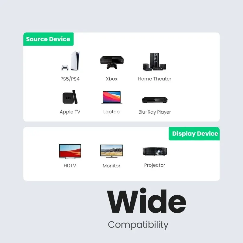 Compatible con 8K 50Hz, 4K 120Hz UHD, 4K 100Hz y más, el cable compatible con 8K versión HDMI 2,1 proporciona una experiencia cinematográfica Ultra HD y efectos visuales 3D, es compatible con sus dispositivos de transmisión, Apple TV 4K, NVIDIA SHIELD TV, reproductores de CD/DVD/Blu-ray, Fire TV, Roku Ultra, PS5, PS4, PS3, Xbox One/360, Nintendo Switch, ordenadores u otros dispositivos compatibles con HDMI a su TV 4K/HD, monitores, pantallas o proyectores.