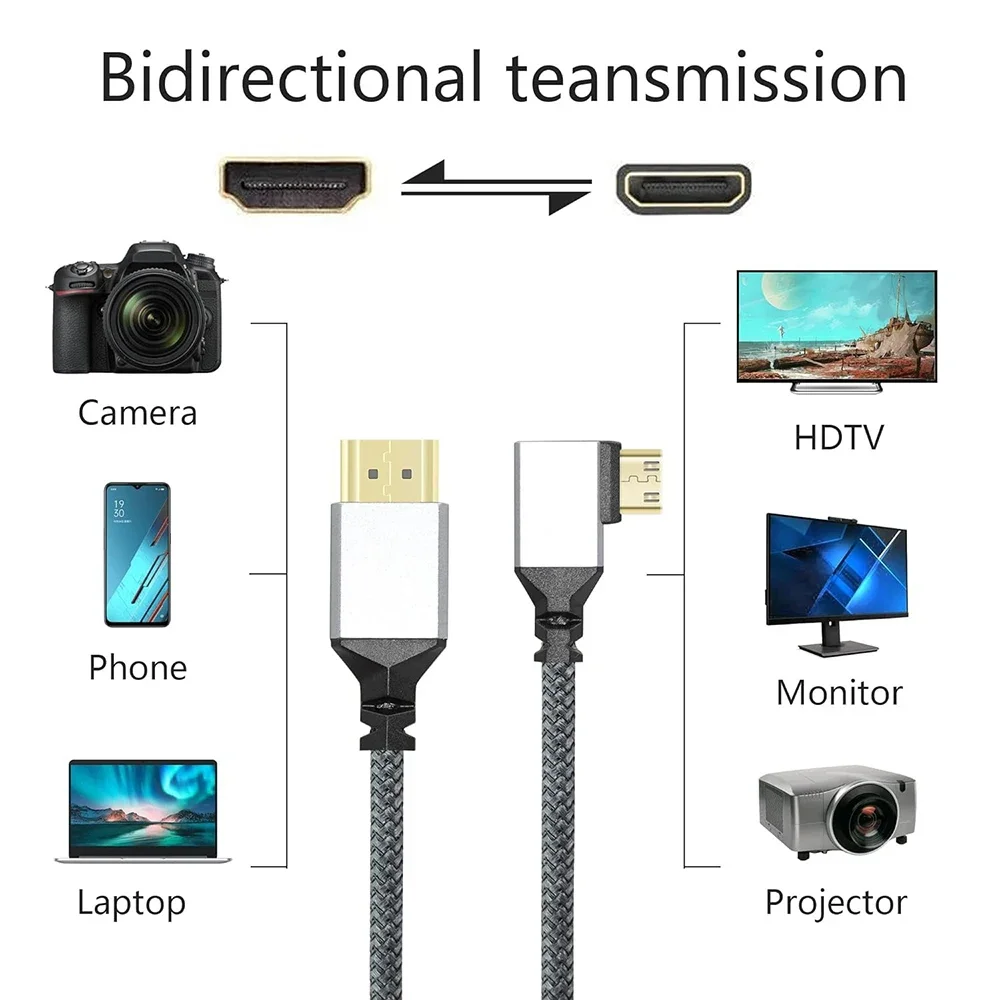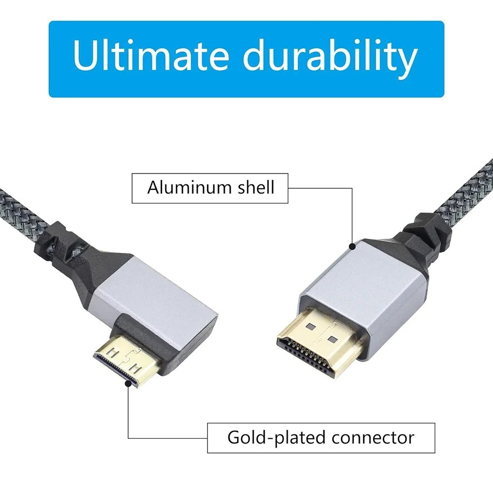 modname=ckeditor Características: 1.Diseño de 90 grados.Diseño de conector mini HD de ángulo izquierdo de 90 grados, evita doblar el cable a largo plazo para dañar el cable, se puede usar en espacios estrechos, muy práctico. 2.4K UHD.Cumple con los últimos estándares HD, admite salida de video 4K UHD, salida de video 4K UHD Se requiere televisor/monitor equipado 4K, brinda imágenes y sonido realistas. 3.Transmisión estable.Utilizando una elegante carcasa de aluminio y conectores chapados en oro, los conductores y láminas de cobre desnudos y las capas de blindaje trenzadas evitan eficazmente la interferencia EMI y garantizan una transmisión de señal más estable. 4.Material de alta calidad.El uso de una carcasa de aluminio de alta calidad, resistente y duradero, resistente a la corrosión, el alambre trenzado de nailon agrega durabilidad adicional y una vida útil más larga y sin enredos. Lista de paquetes: 1 cable HD.