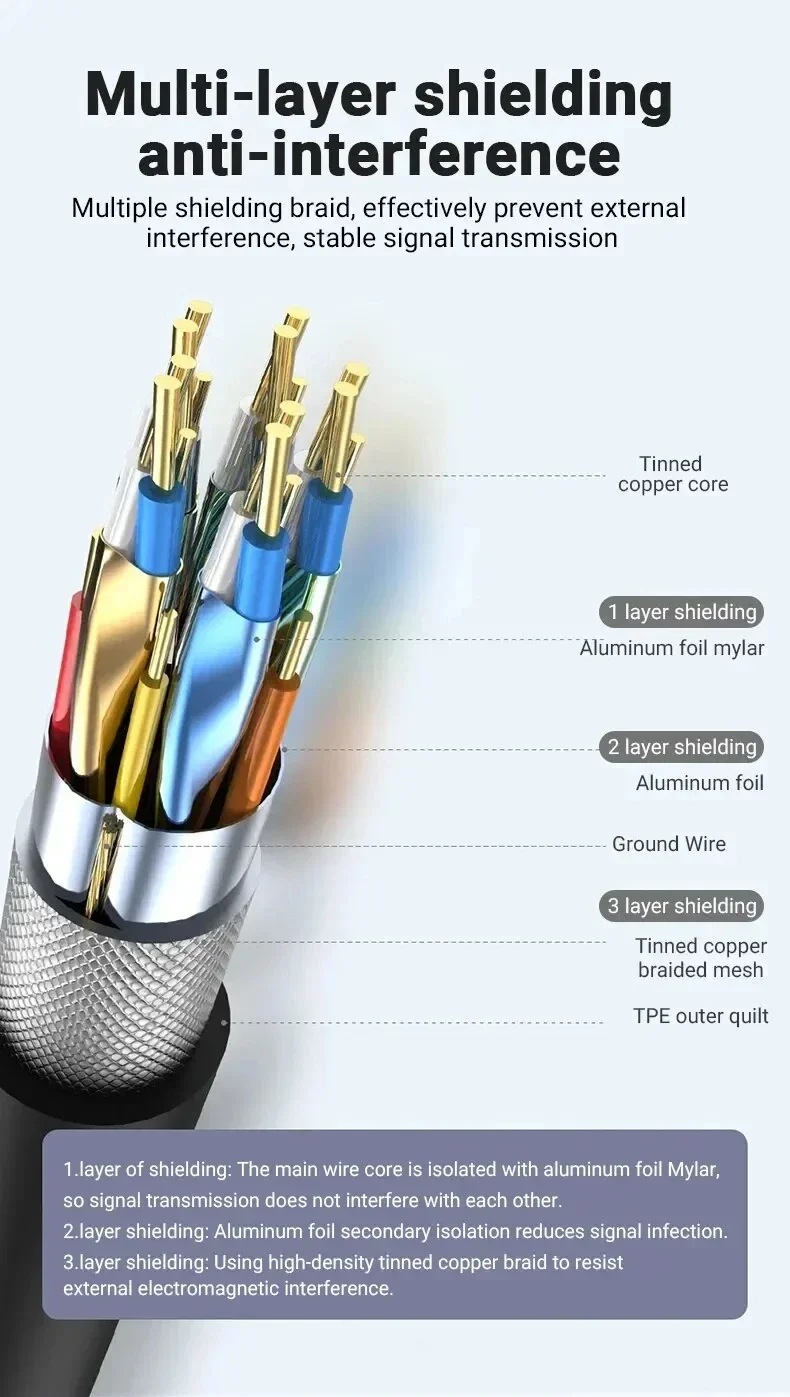 ● Hecho de conector chapado en oro y carcasa de aleación de zinc/aluminio y tres capas de blindaje, que proporciona una mejor corrosión y máxima durabilidad, y puede mejorar la transmisión de la señal. El trenzado de nailon hace que el cable sea flexible y resistente al desgaste, lo que puede evitar que el cable se desordene y se rompa.