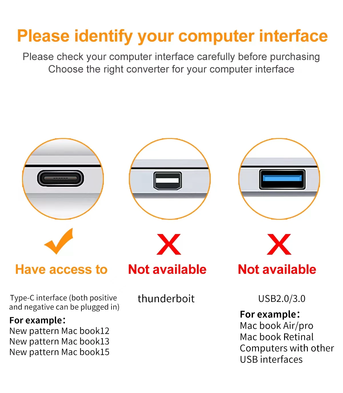 Carga el portátil a través de una interfaz hembra tipo C. 5W-60W de adaptación automática.