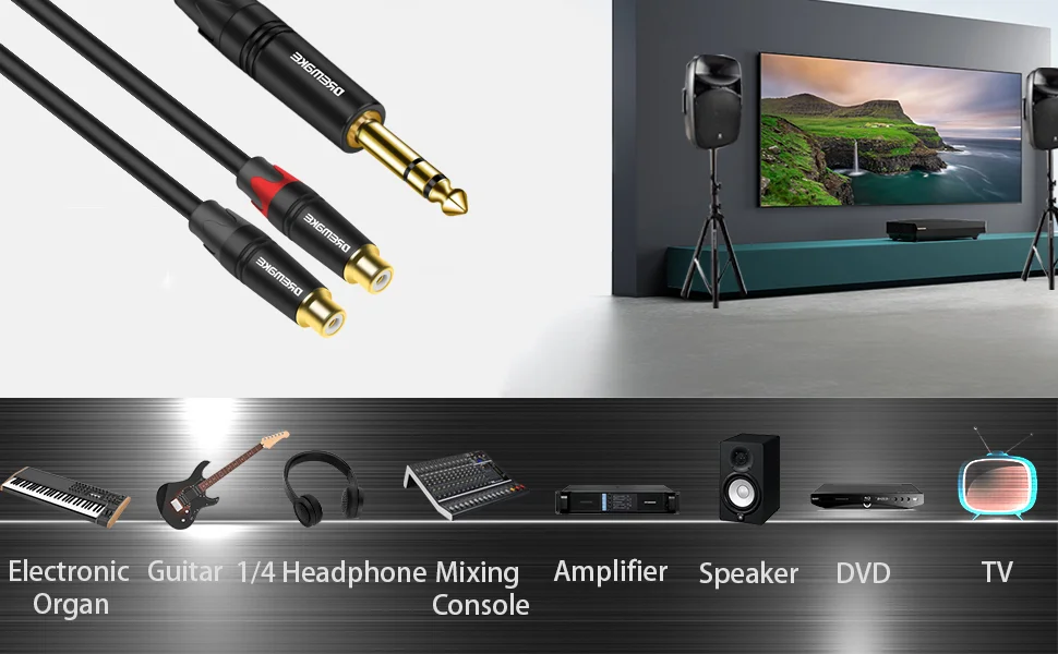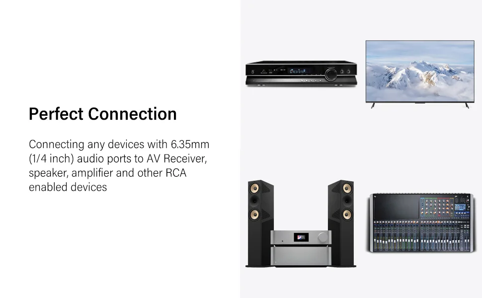 ⭐Adaptador divisor Y estéreo macho de 6,35mm a 2 RCA hembra: Conector estéreo de 1/4 pulgadas y 6,35mm a cable divisor 2RCA. Este cable de audio macho de 6,35mm a hembra 2RCA le ayuda a dividir la entrada estéreo del conector de 6,35mm y 1/4 pulgadas.