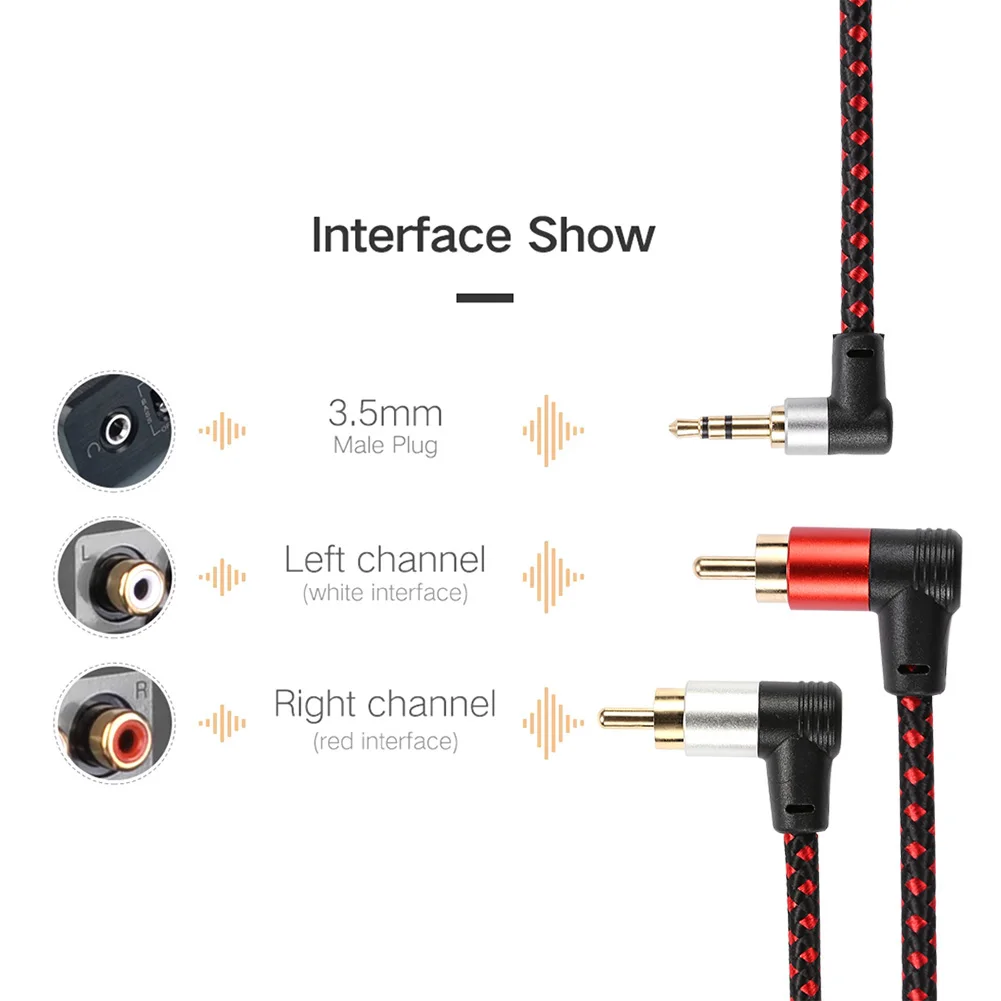 6. Conductor libre de oxígeno de cobre, trenzado de algodón suave duradero, ángulo de 3,5mm(1/8 ") estéreo macho chapado en oro, RCA ángulo 2 (derecha/izquierda) estéreo macho chapado en oro enchufe