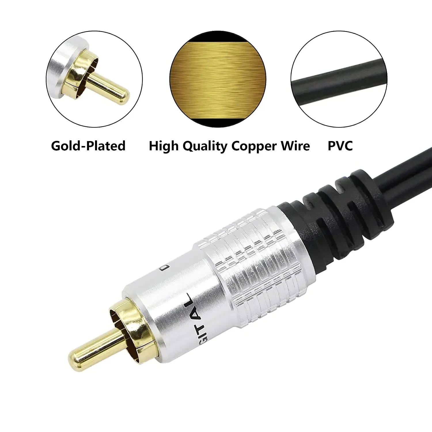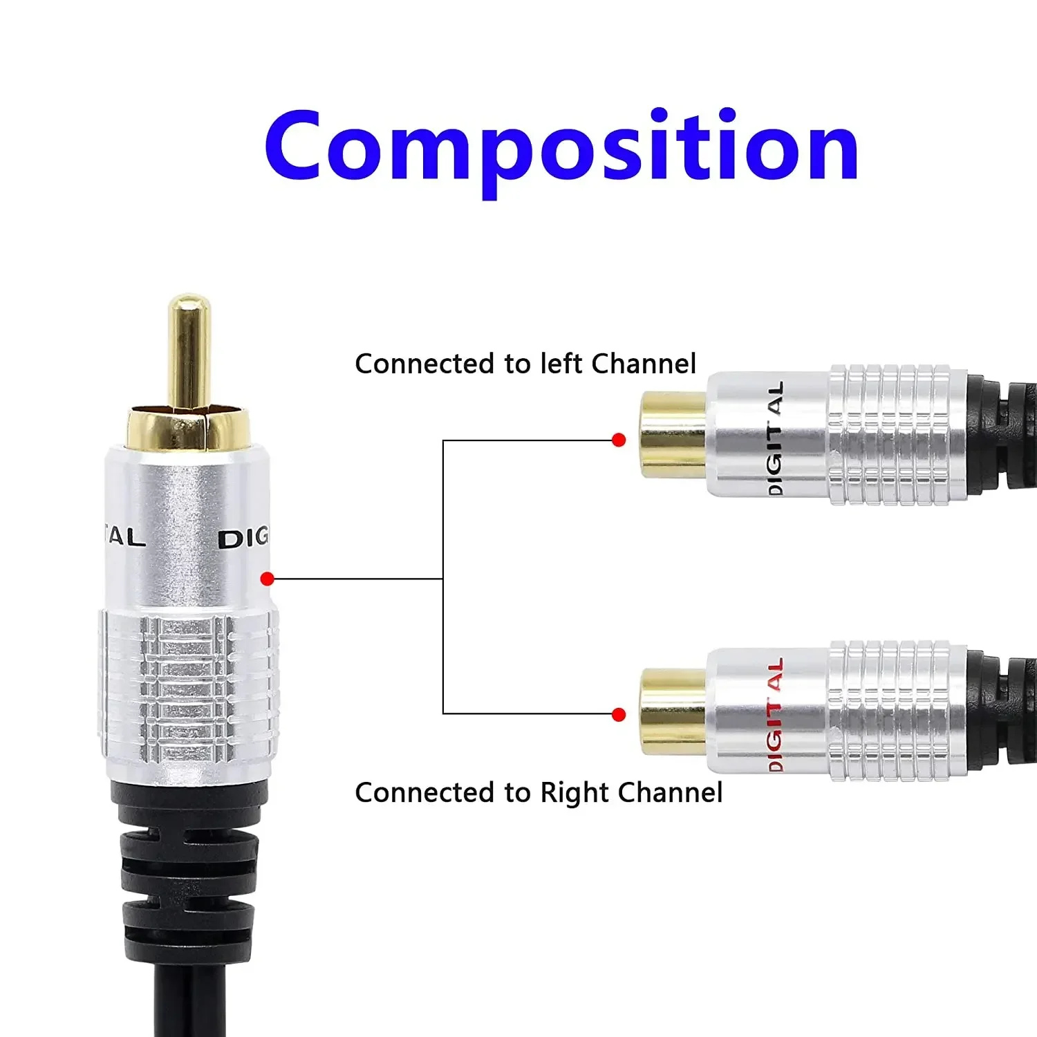 Adaptador RCA en Y con 1 Conector RCA macho a 2 enchufes de audio RCA hembra, convierte la señal de un solo conector RCA (mono) a conectores RCA duales (estéreo). Material: Hecho de conectores chapados en oro de aleación de aluminio puro Premium, doble blindaje (cobre trenzado y Mylar de aluminio) protege contra interferencias RF/EM. Este cable RCA conecta los puertos de audio (izquierdo y derecho) de un receptor (A/V), subwoofer o amplificador a TV, reproductor de CD, reproductor de DVD y otros dispositivos habilitados para RCA. Funciona muy bien para conectar sus teléfonos inteligentes, MP3, tabletas a cine en casa, reproductor de CD/DVD, HDTV, consolas de juegos, sistemas Hi-Fi con enchufes 2RCA. Cada cabezal conector cuenta con anillos de color de fuente integrados para garantizar un agarre firme al instalar o quitar el cable divisor RCA. Este código de cable RCA está diseñado para duplicar una señal mono, conectar su salida a las conexiones RCA y luego tener una señal duplicada. NOTA: Este NO es un divisor multicanal coaxial de audio digital. Solo un simple divisor de mono, no funciona para el reproductor de blu-ray, no viene con auriculares inalámbricos de salida.