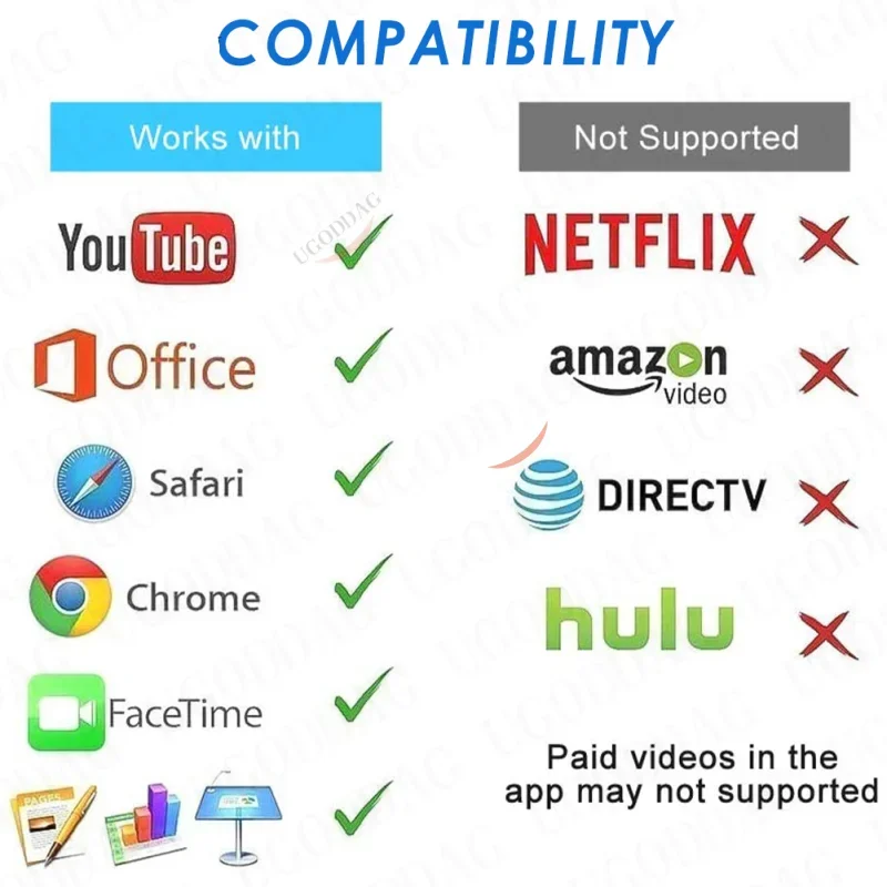 1. Due to copyright protection measures, it won't support some paid contents including for Netflix, Amazon Prime videos,Hulu, Comcast tv, Xfinity, Vudu, DIRECTV, iFlix etc. Please refer to the terms and conditions of those apps.