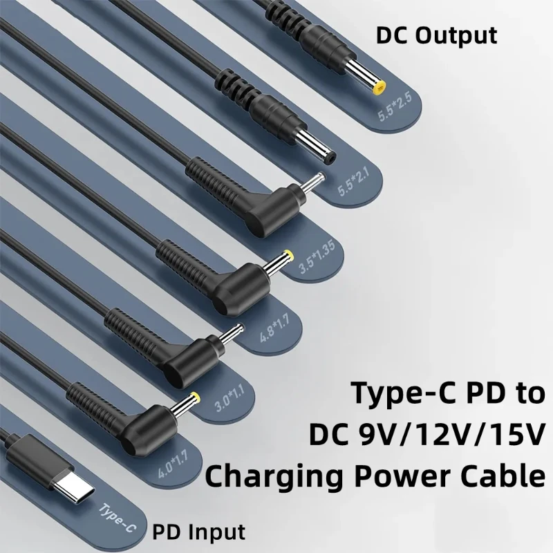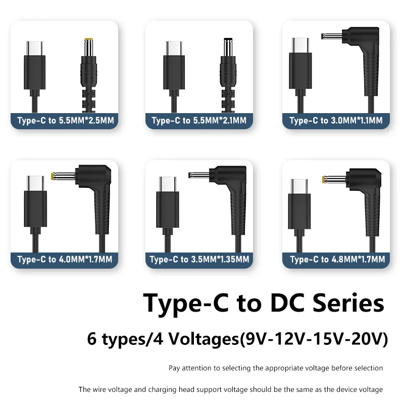 4. 6 conectores de cable diferentes con salida de 9V,12V,15V,20V: 5,5*2,5mm/5,5*2,1mm/4,8*1,7mm/4,0*1,7mm/3,5*1,35mm/3,0*1,1mm. Fácil de usar, enchufar y usar. (NOTA: 1. Compruebe y confirme el tipo de interfaz de sus dispositivos que necesita cargar antes de realizar el pedido.