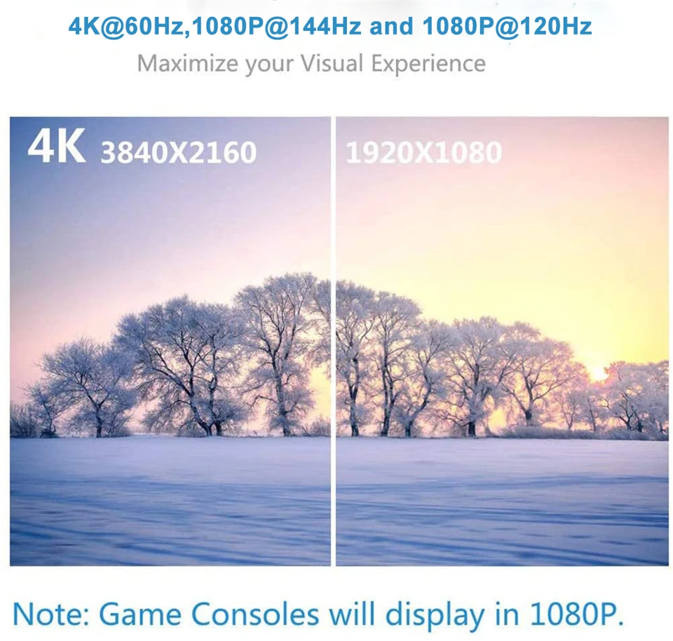 · Soporta 4K y vídeo y audio de alta calidad: 4K UHD (3840x2160) @ 60Hz, 1080p (1920x1080) Hz @ 120/144Hz, Audio: audio envolvente de 7,1 canales con frecuencia de muestreo de hasta 192 kHz. Ten en cuenta que las consolas de juego nativas 4K @ 60Hz (como XBOX One S) se mostrarán en 1080p.