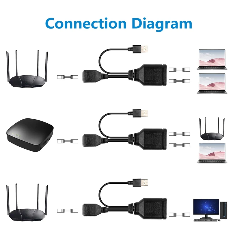 1. Divisor Ethernet: este divisor Ethernet Rj45 se utiliza principalmente para resolver problemas de conexión causados por un cableado insuficiente. Alimentado por USB, admite dos ordenadores para compartir un cable Ethernet al mismo tiempo.