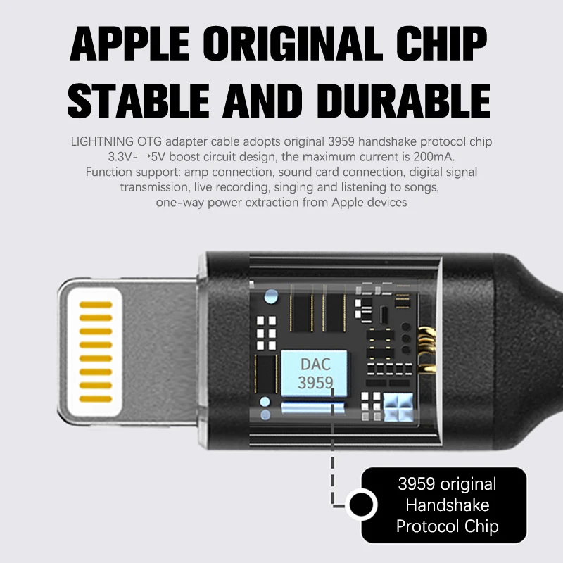 Chip de protocolo de comunicación original 3959, diseño de circuito de refuerzo, calidad de sonido muy mejorada; Conexión de amplificador de oído, conexión de tarjeta de sonido, transmisión de señal digital, grabación en vivo, canto y escucha, fuente de alimentación unidireccional para dispositivos Apple.