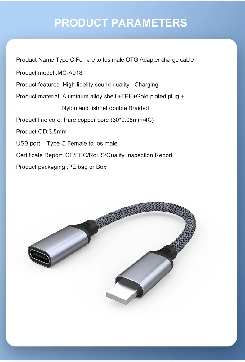 Nombre del producto -- Cable de carga del adaptador OTG macho tipo C hembra a iOS