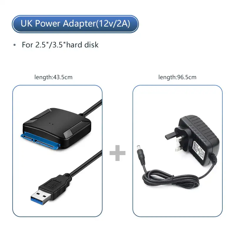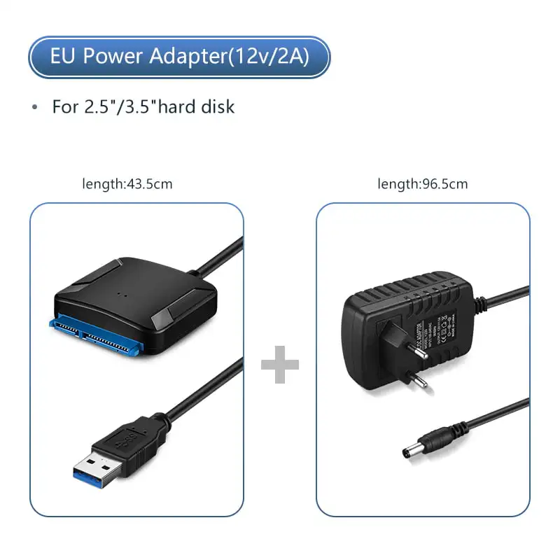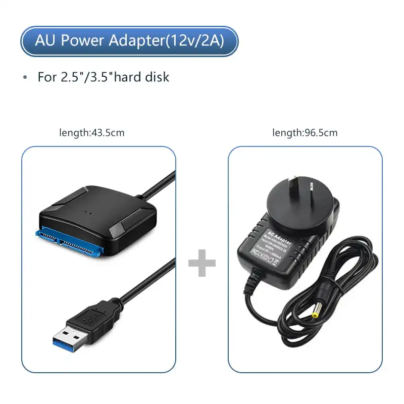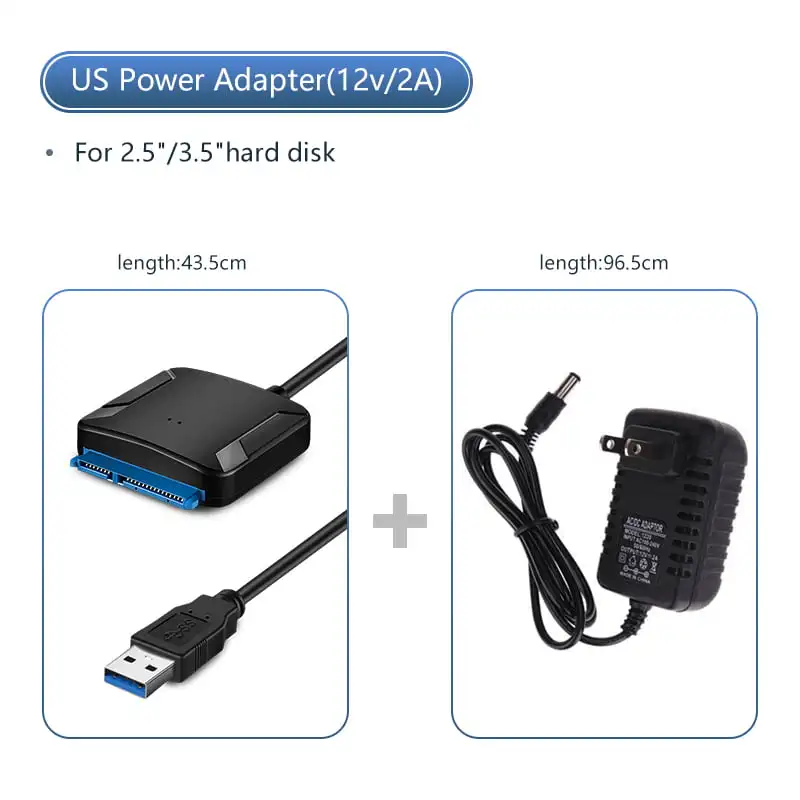 Este adaptador de disco duro de 2,5 "3,5" está equipado con una fuente de alimentación de 12V 2A, necesita la fuente de alimentación para usar el adaptador con una unidad giratoria de tamaño completo porque el USB simplemente no proporciona suficiente energía para ejecutar una unidad de 3,5 ". Pero para unidades de ordenador portátil (2,5 ") o SSD, no necesita la potencia