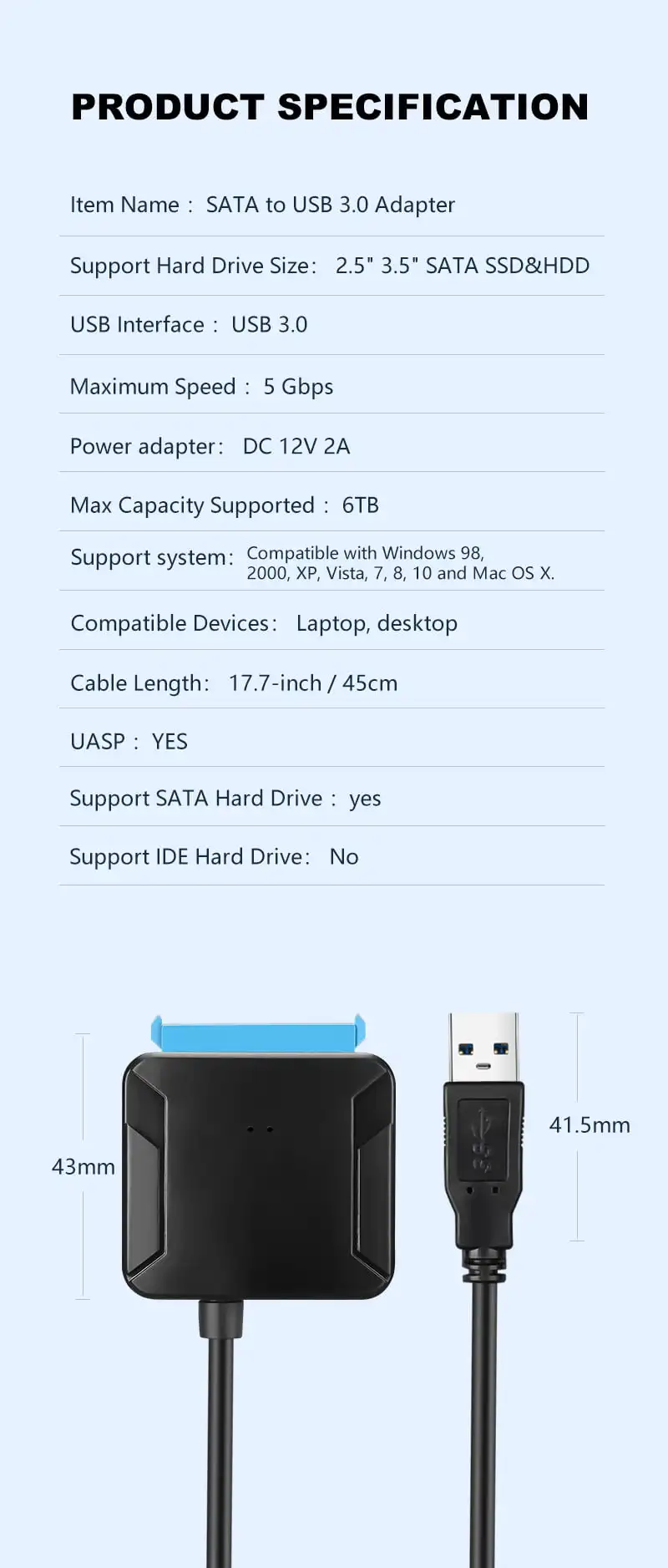 El cable adaptador SATA a USB 3,0 le permite conectar cualquier carcasa móvil SATA HDD estándar de 2,5 "o 3,5" a su ordenador/portátil a través del puerto USB 3,0. Es ideal para hacer copias de seguridad de archivos o actualizar el disco duro de su portátil/PC, admite una capacidad HDD de hasta 6TB.