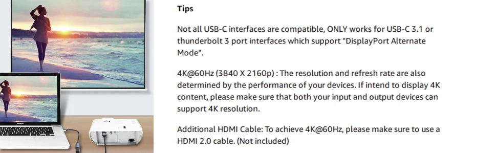El adaptador USB HDMI permite una resolución de hasta 3840*2160 @ 60Hz (4K 60Hz) y es compatible con versiones anteriores de 480p,360p,720p,1080p.Compatible con transferencia de vídeo, audio e imágenes y otros teléfonos portátiles con adaptador tipo C. Mejora el chip integrado, mejor transferencia de señal y estructura interna completa, duradera y segura de usar.