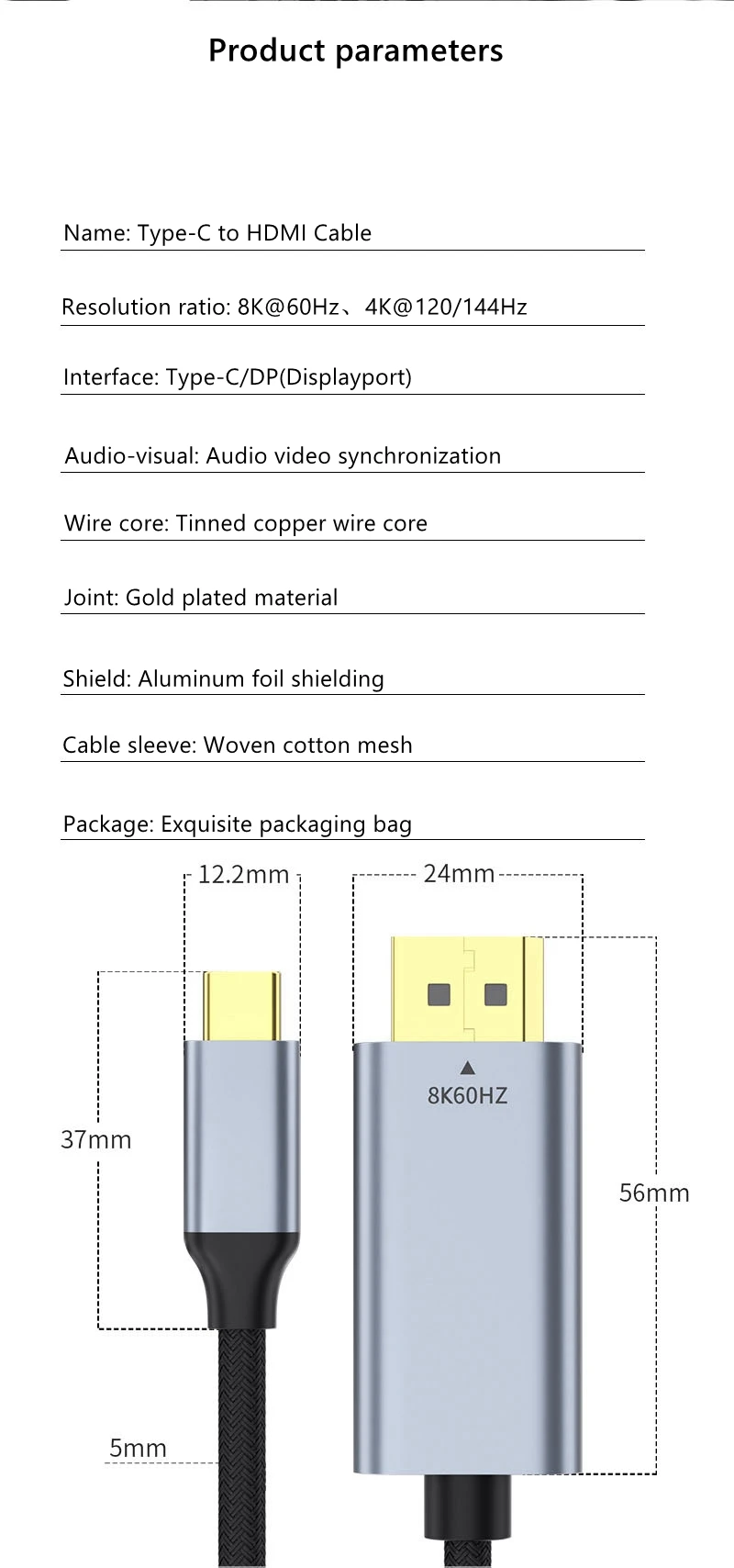 Cable adaptador de vídeo HD tipo C a DP 8K 60Hz proyección de pantalla de teléfono para computadora host proyector pantalla PS4 conexión TVDescripción