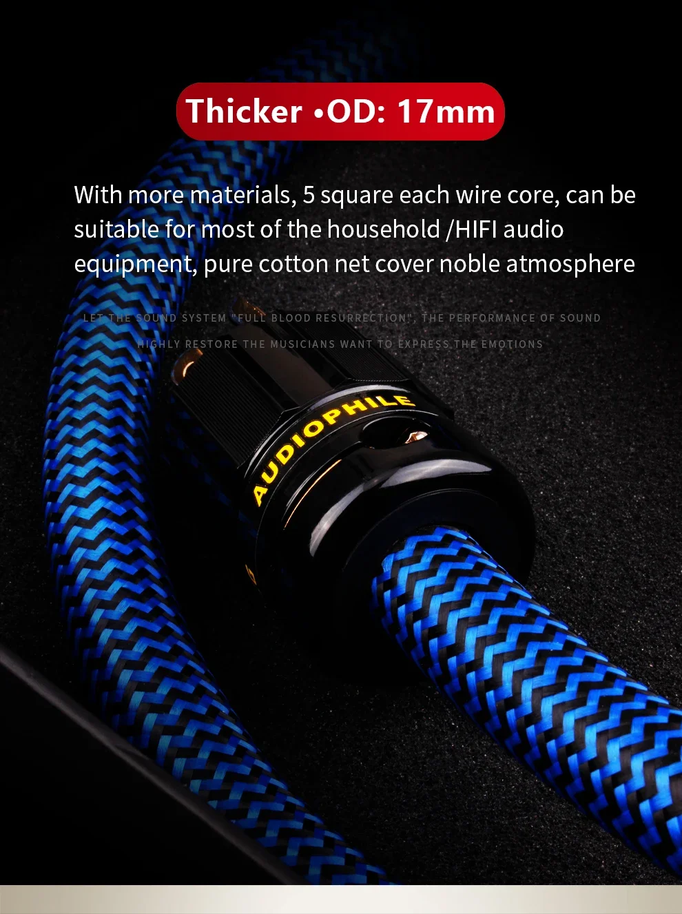 3. Más grueso.OD: 17 mm Con más materiales, 5 cuadrados cada núcleo de cable, puede ser adecuado para la mayoría de los equipos de audio domésticos/HIFI, cubierta de red de algodón puro, atmósfera noble