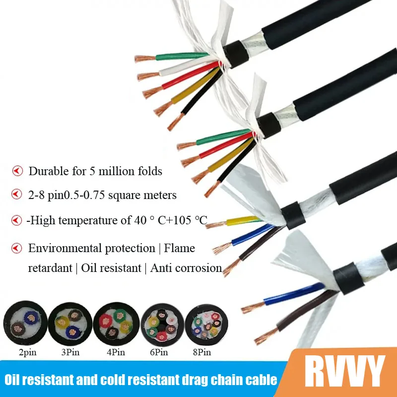 Comprar Cable de alimentación de cadena de arrastre resistente a las heladas y al aceite, Cable de alta flexibilidad, 1M, RVVY 2, 3, 4, 5, 6, 7, 8 pines, 0,5/0,75/1,5/2,5