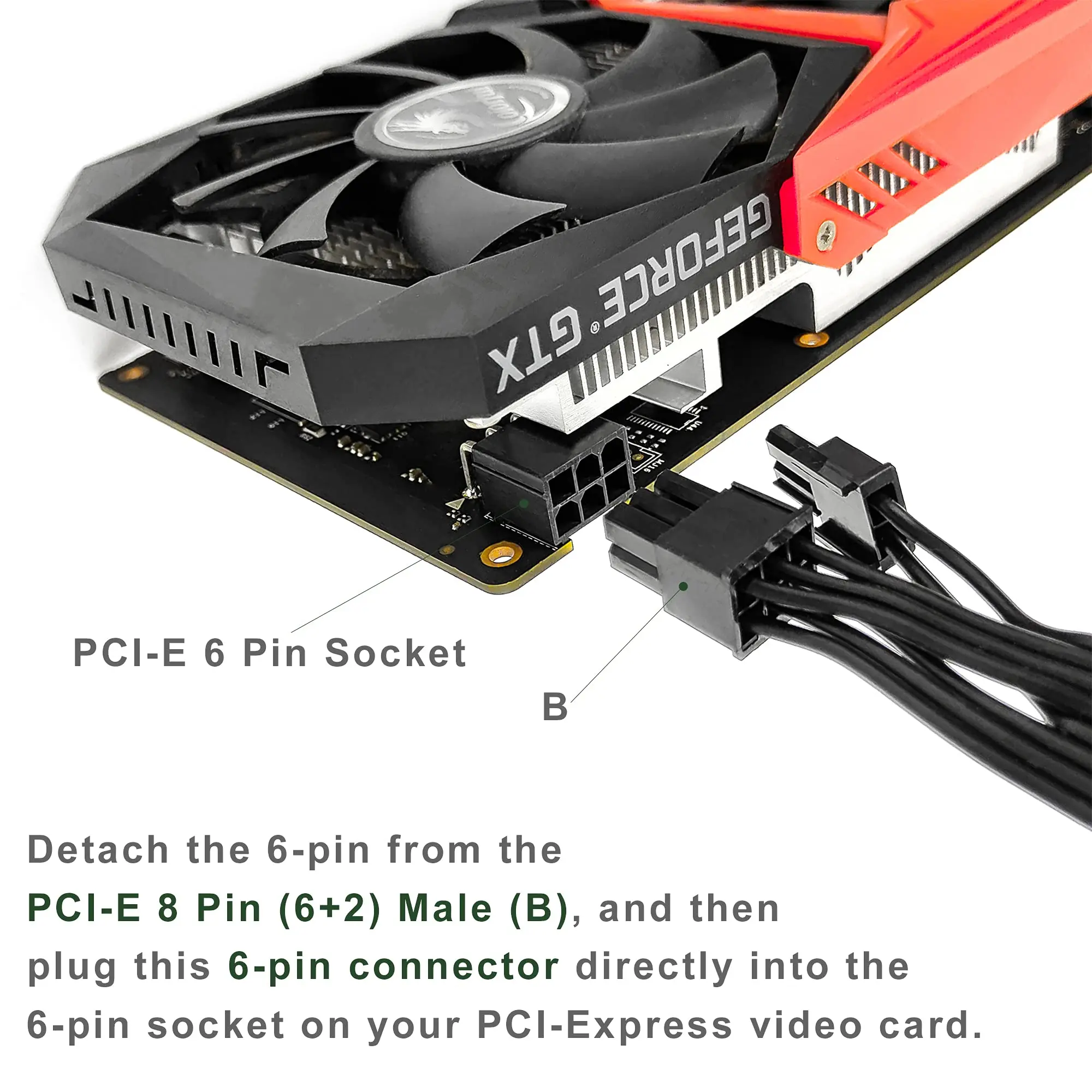3.El cable PCIe se puede utilizar como 6 pines u 8 pines deslizando hacia adentro/apagando los 2 pines.Compatible con tarjetas de vídeo PCI-E que tienen una toma de corriente de 8 pines, 6 pines o 8 pines + 6 pines.Como ASUS, ASRock, Gigabyte, Radeon, Sapphire, NVIDIA Tesla GPU, etc.Potencia de soporte para GTX1080, GTX1080Ti, RTX2060, RTX2070, RTX2080, RTX2080Ti, RTX3060, RTX3070, RTX3080 Ti, RTX3090 Ti, RTX4060.RTX4080, RTX4090, RX570, RX580, RX590, RX5700 XT, RX6700 XT, RX6800 XT, RX6900 XT, etc.