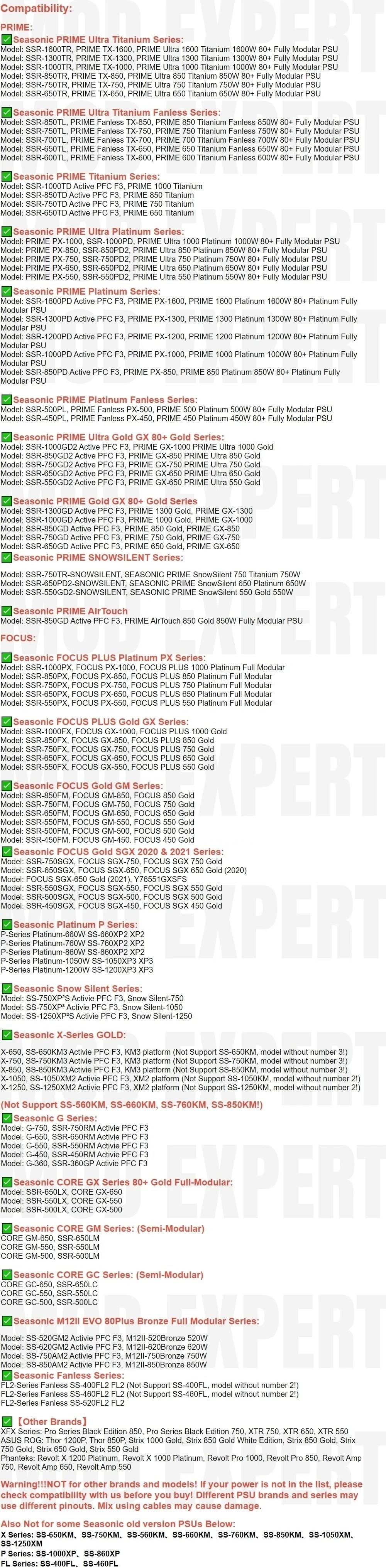 Lista de paquetes: 1 cable de alimentación de red con funda de 24 pines para fuentes de alimentación modulares Seasonic.