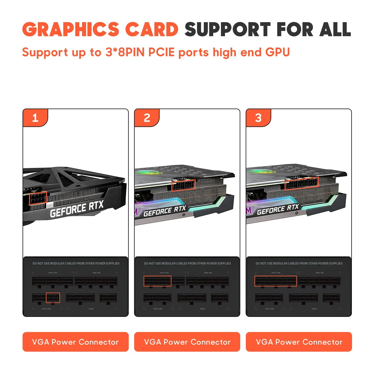 3.El cable PCIe se puede utilizar como 6 o 8 pines deslizando hacia adentro/apagando los 2 pines.Compatible con tarjetas de vídeo PCI-E que tienen una toma de corriente de 8 pines, 6 pines o 8 pines + 6 pines.Tales como: ASUS, ASRock, Gigabyte, Radeon, Sapphire, NVIDIA Tesla GPU, etc.4.Potencia de soporte para GTX1080, GTX1080Ti, RTX2060, RTX2070, RTX2080, RTX2080Ti, RTX3060, RTX3070, RTX3080 Ti, RTX3090 Ti, RX570, RX580, RX590, RX5700 XT, RX6700 XT, RX6800 XT, RX6900 XT.