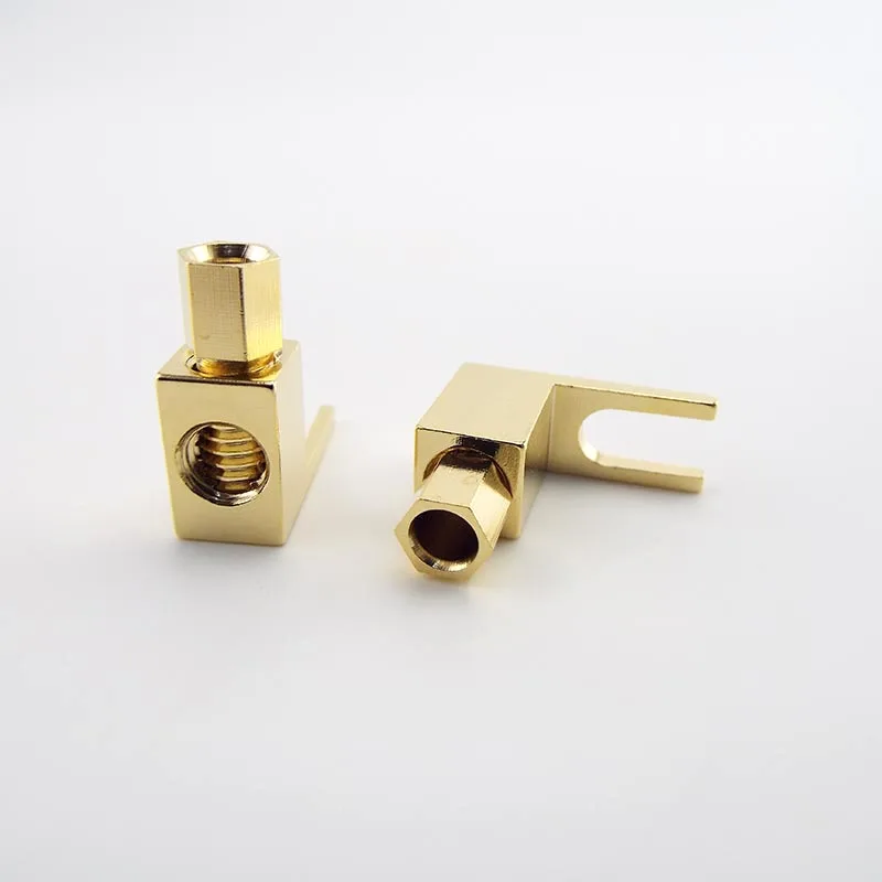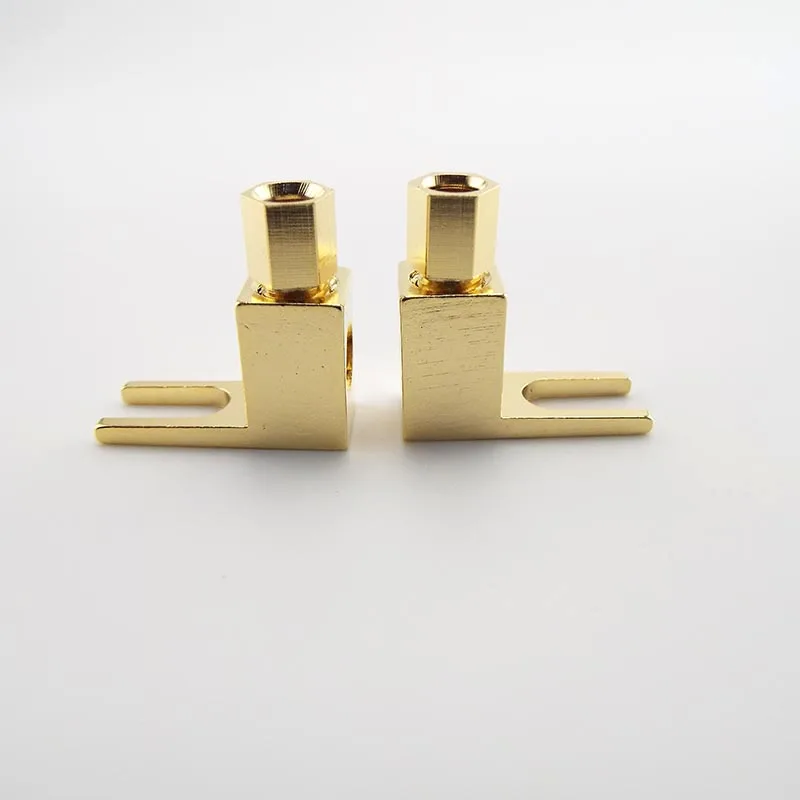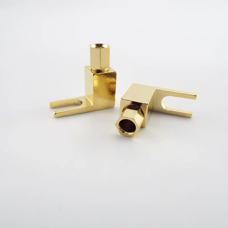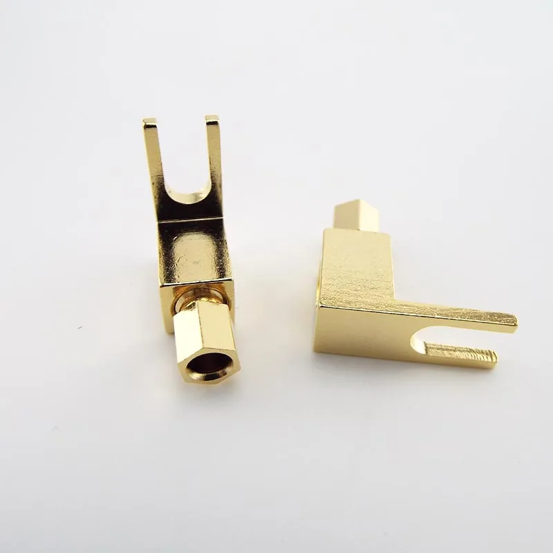 Conector tipo banana de 4mm, Cable de altavoz Hifi de ángulo recto chapado en oro Y pala para conector de Audio, adaptadores de enchufes eléctricos Nombre del artículo: Conector macho banana de horquilla en ángulo recto