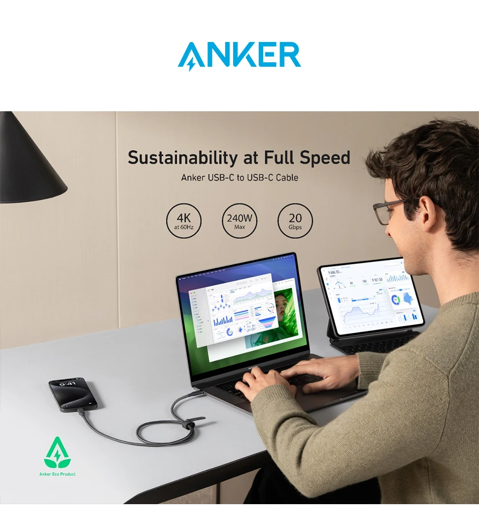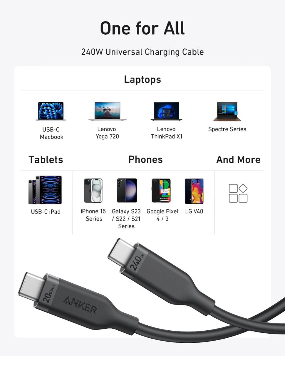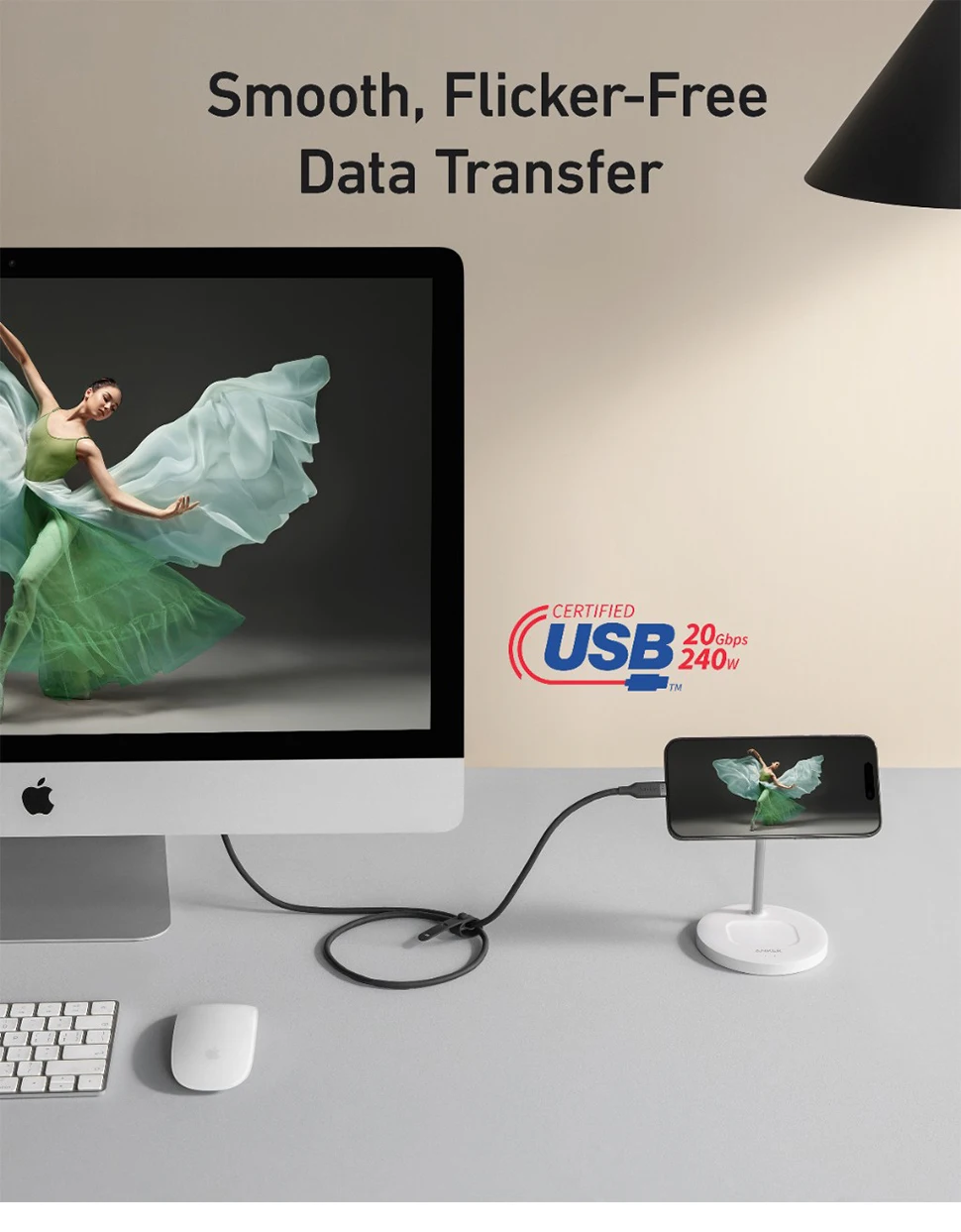 Comprar Cable Anker USB4 Gen 2, transferencia de datos de 20 Gbps, pantalla HD 4K, cable de carga USB C a USB C a base biológica de 3 pies de 240 W, para iPhone 15