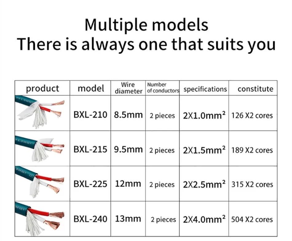 1.BLX-210126 núcleos * 2Área de sección: 1,0 mm 2Aplicable a: audio multimedia pequeño/audio para coche.Potencia recomendada entre 10W-200W2.BLX-215189 núcleos * 2Área de sección: 1,5 mm 2Aplicable a: sistema de sonido de cine en casa, sistema de sonido principal de ingeniería.Potencia recomendada entre 80W-500W3.BLX-225315 núcleos * 2Área de sección: 2,5 mm 2Aplicable a: altavoz principal de cine en casa, ingeniería/rendimiento.Potencia recomendada entre 150W-1500W4.BLX-240504 núcleos * 2Área de sección: 4,0 mm 2Aplicable a: altavoz principal de alta potencia o altavoz ultrabajoPotencia recomendada entre 200W-3000W