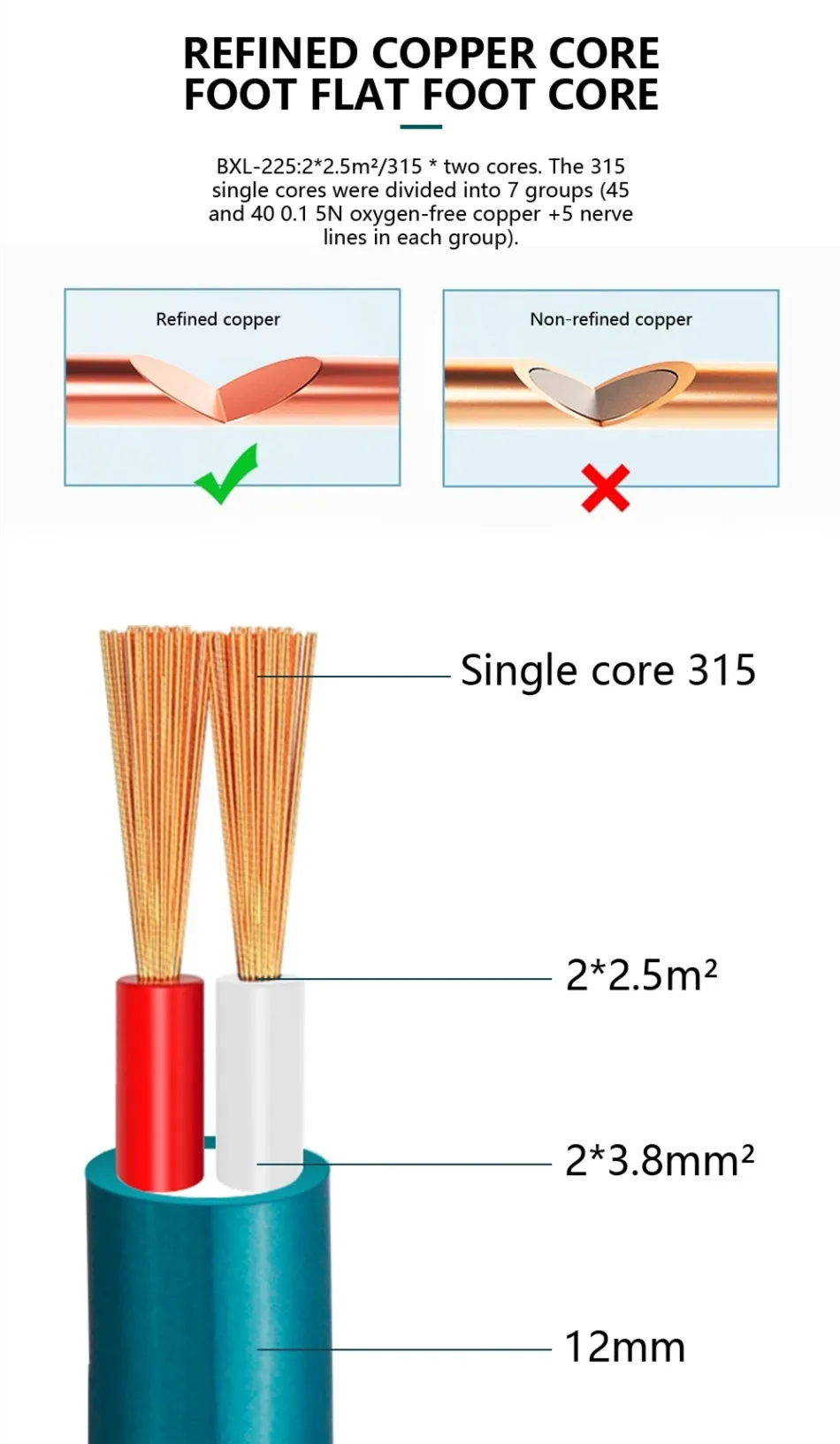 NÚCLEO DE PIE DE NÚCLEO DE COBRE REFINADO NÚCLEO DE PIE FLATBXL-225: 2*2.5m2/315 * dos núcleos.Los 315 núcleos individuales se dividiron en 7 grupos (45 y 40 0,1 5N cobre libre de oxígeno + 5 pulgadas nerviosas en cada grupo)