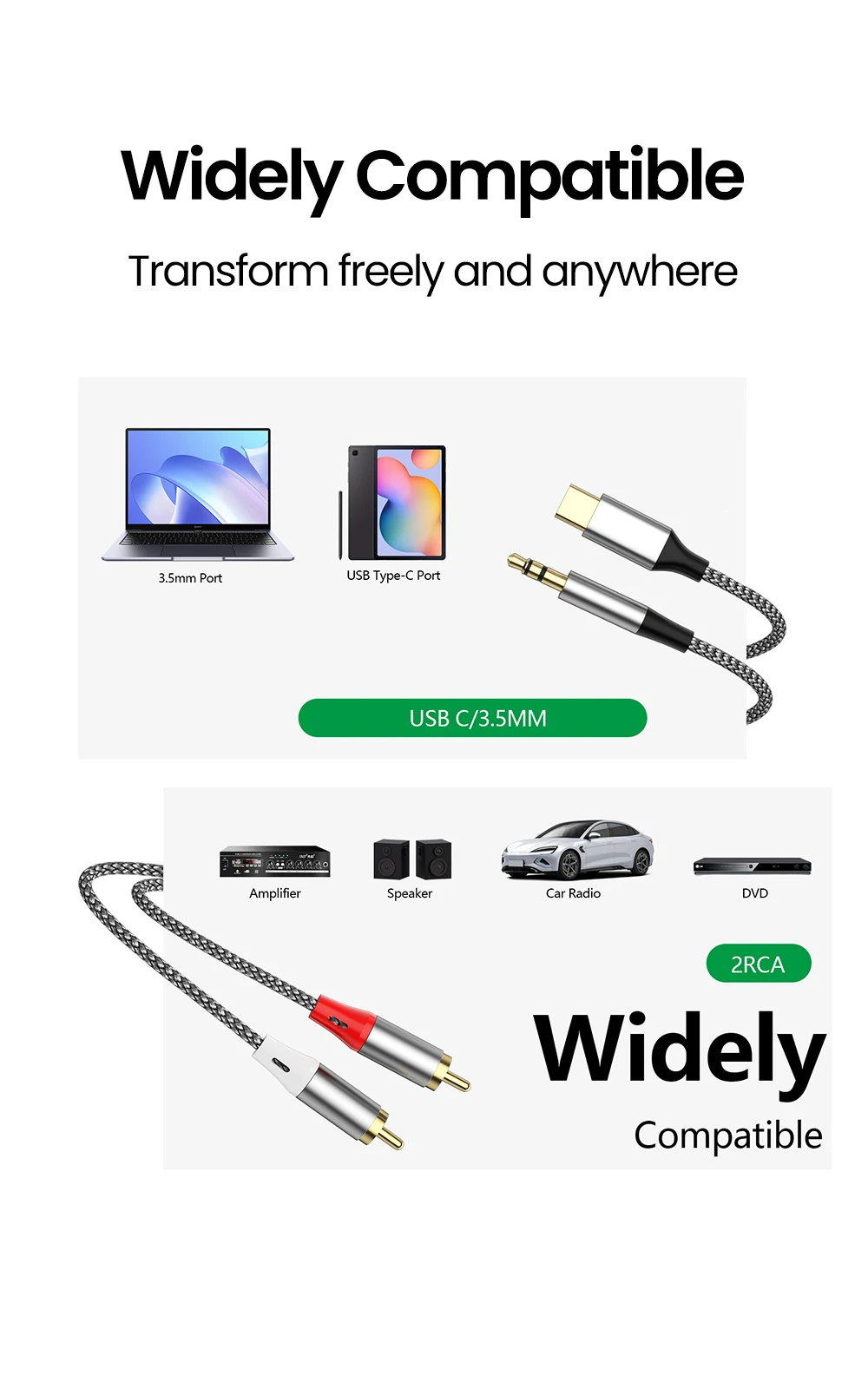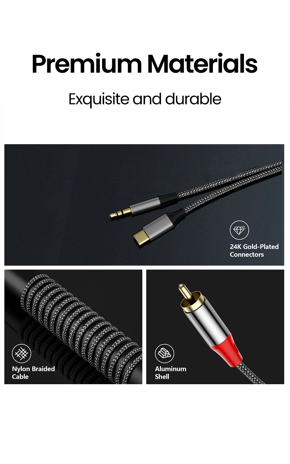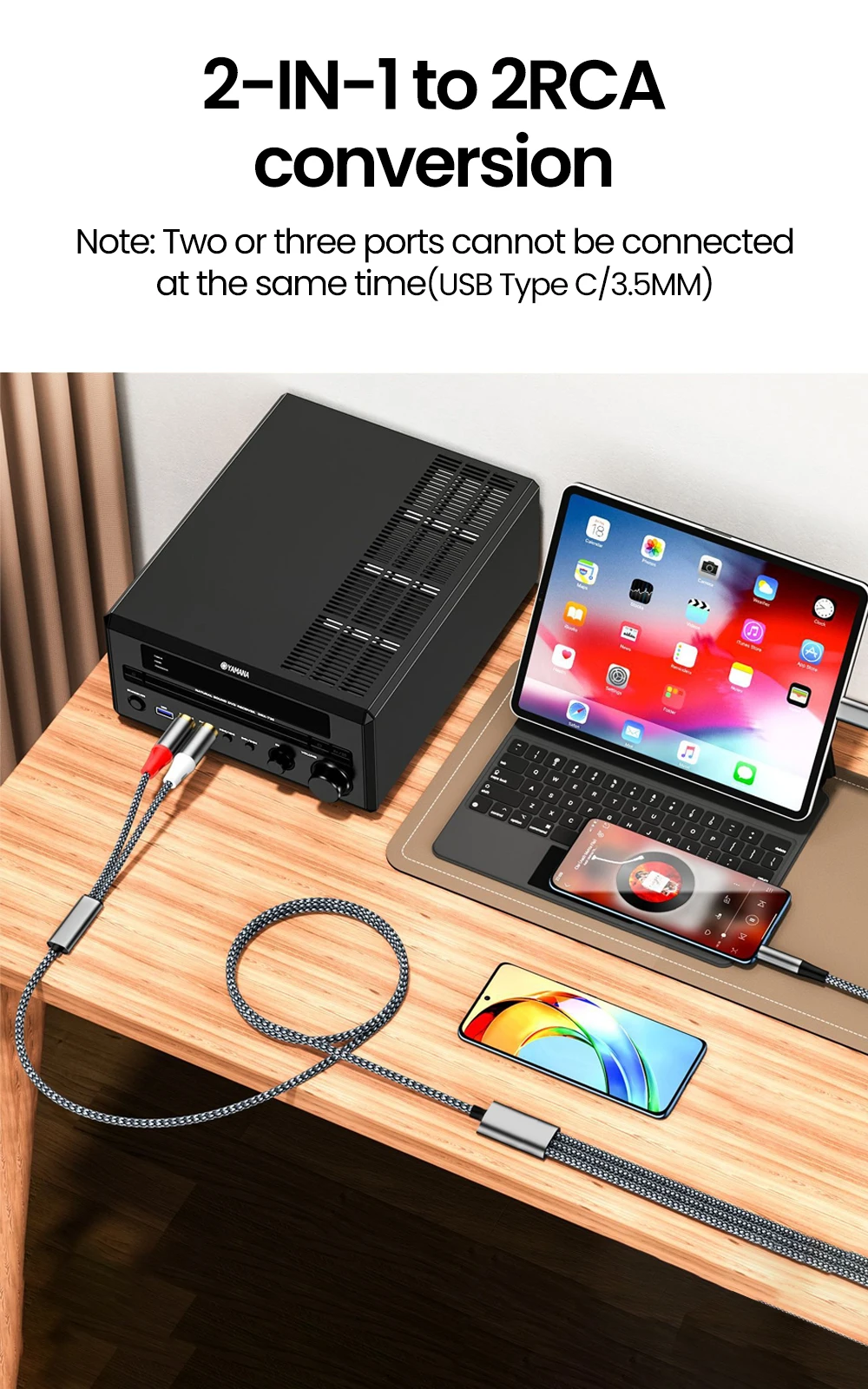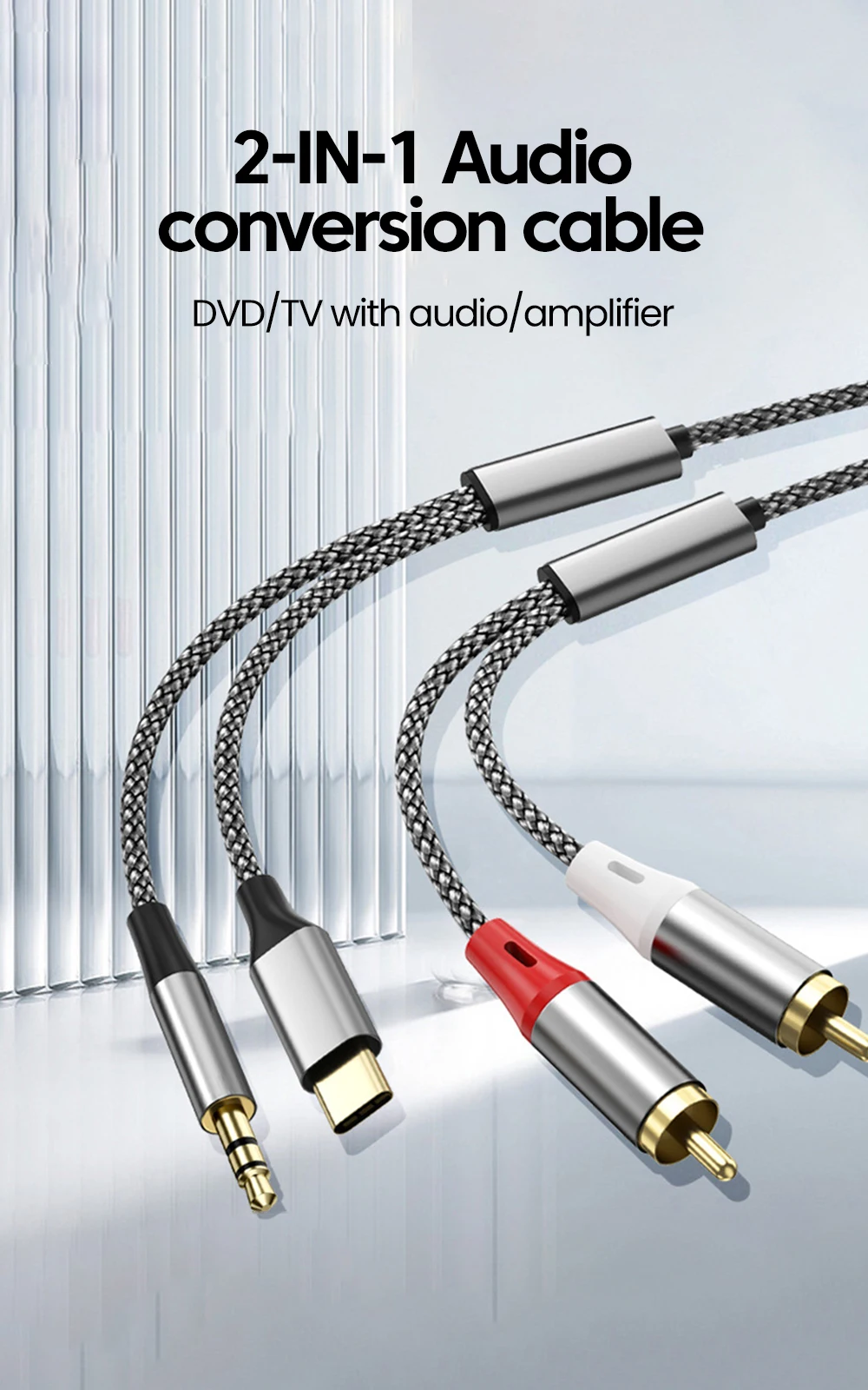 1. Cable de audio Lotus TYPE-C + 3,5 mm a 2RCA, adecuado para DVD, audio, amplificador y otros dispositivos.