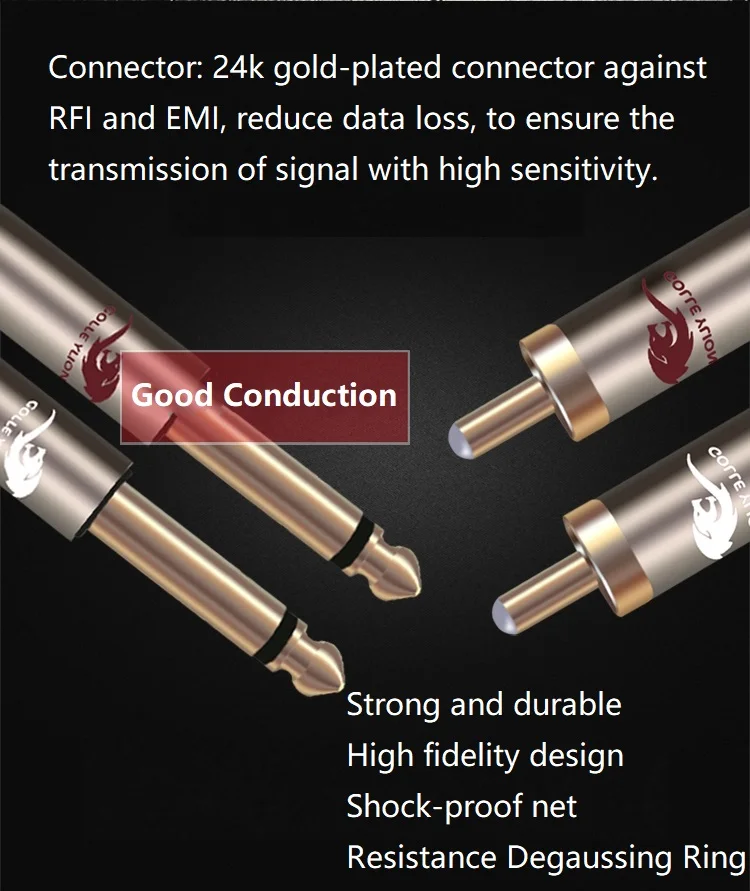 Detailed product description: Type:6.35mm to doul RCA coaxial audio cable Lotus Interface: 6.35mm - 2 RCA cable Color: Red Length: have 1.5-30METER (If you need other length,please contact us.) Conductor: High-quality 4N OFC, antioxidant, for easy transfer and long service life Connector: thick 24K gold-plated connectors Material: 24K gold-plated terminals, copper alloy head assembly, the use of oxygen-free copper (OFC) import terminal, soft materials such as rubber leather, cable soft, bending resistance, no signal attenuation. Features: 1. The 24k gold-plated terminal,zinc alloy assembly head,a soft rubber material,line soft,good flexibility,signal without any attenuation 2. Using high-purity oxygen free copper (OFC)conductor high shielding core isolation audio cable. 3. Anti interference cable structure design,the maximun shielding all the clutter and high quality multilayer shielding wire material 4. Plug the nonmagnetic zn alloy shell protection 5. High density high shielding fidelity design ,strong anti-interference ability ,transmisson signal effect. 6. This product adopts RHOS standard accord with environmental protection materials SEIK0 ,products withstand all kinds of complex environment corrosion resistance ,is the ideal audio transmission line .......