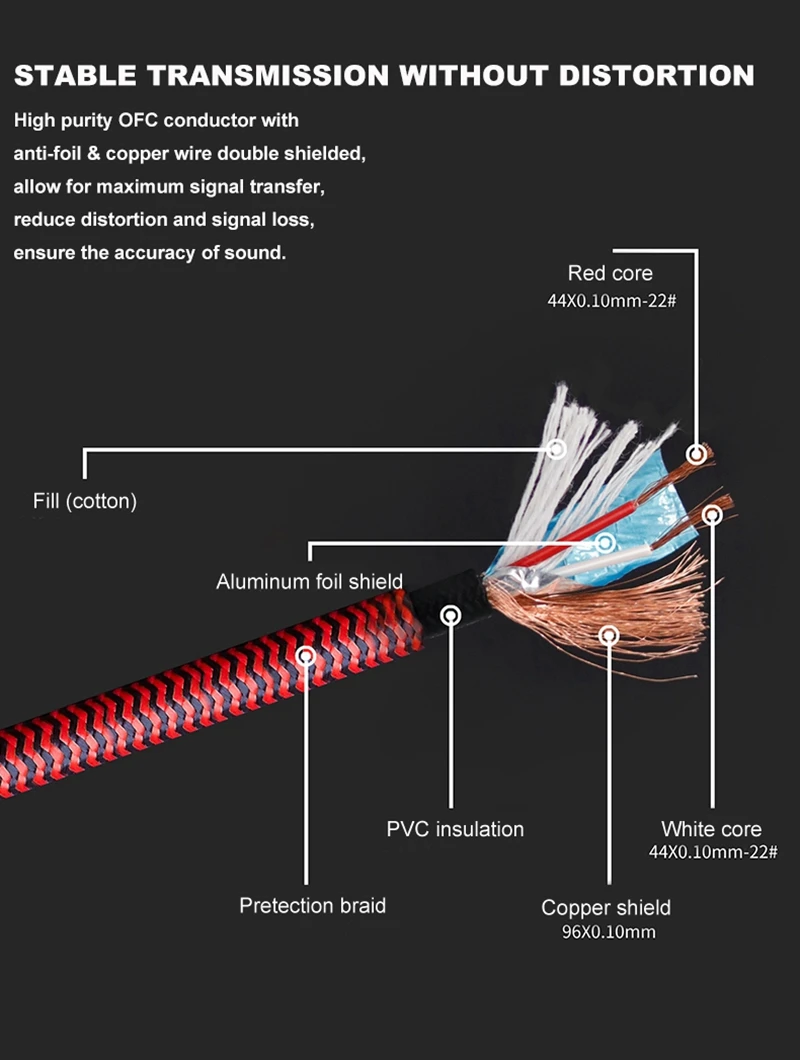 El conductor OFC de alta pureza con blindaje de alta densidad permite la máxima transferencia de señal, reduce la distorsión y la pérdida de señal, para mantener el rendimiento de su dispositivo musical.