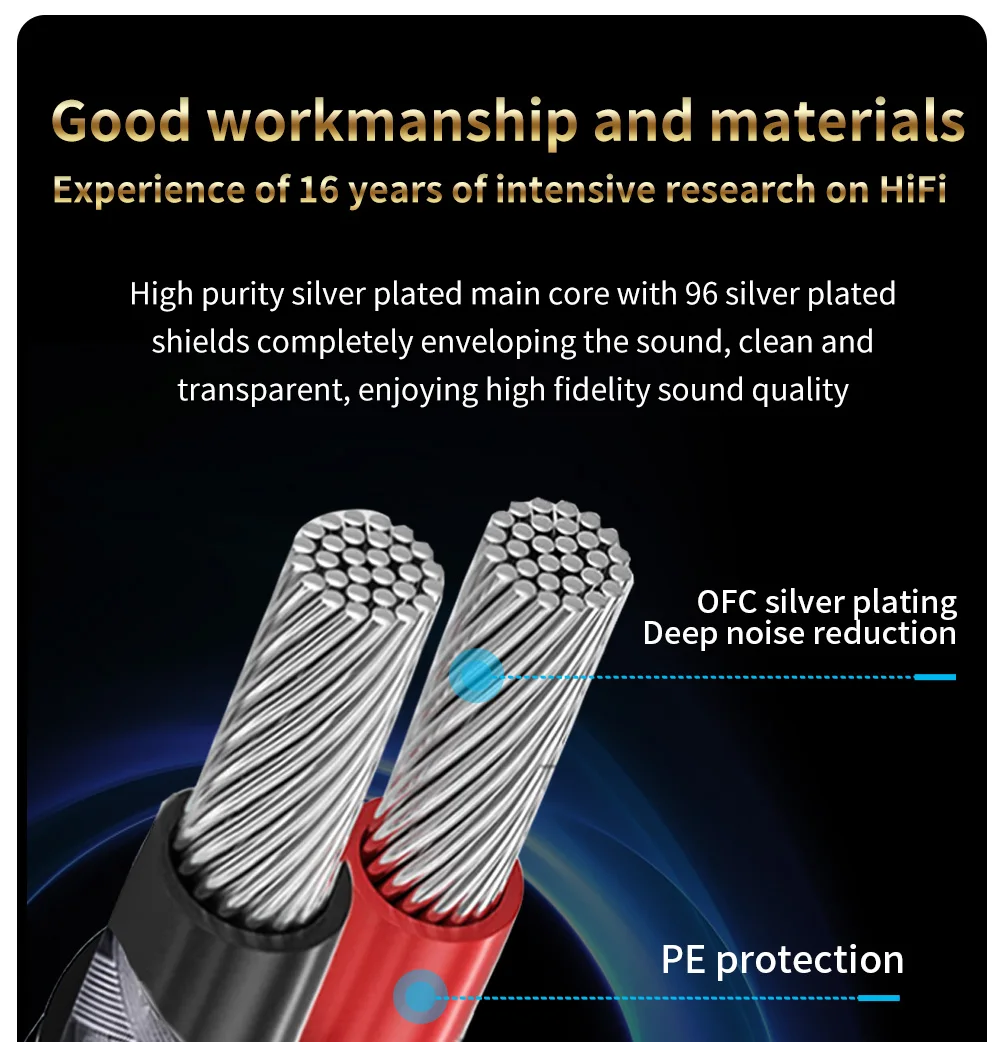 Núcleo principal Chapado en plata de alta pureza con 96 escudos chapados en plata que envuelven completamente el sonido, limpio y transparente, disfrutando de una calidad de sonido de alta fidelidad