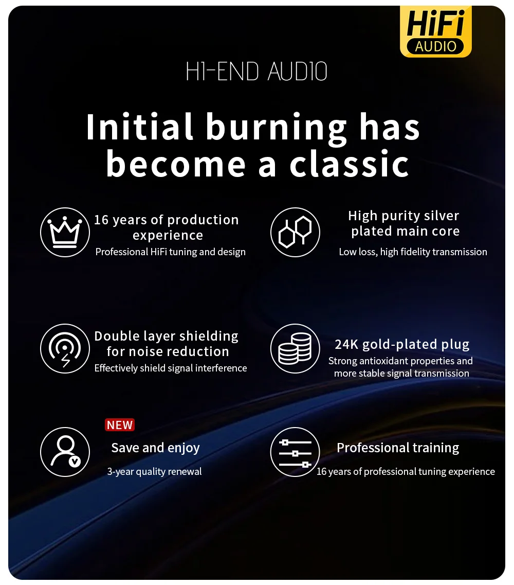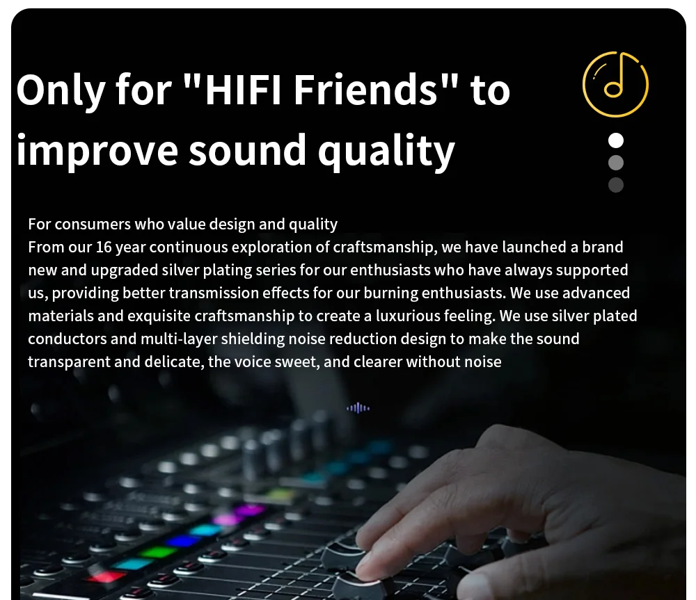 Para los consumidores que valoran el diseño y la calidad de nuestra exploración continua de 16 años de la artesanía, hemos lanzado una nueva y mejorada serie de chapado en plata para nuestros entusiastas que siempre nos han apoyado, proporcionando mejores efectos de transmisión para nuestros entusiastas de la quema. Utilizamos materiales avanzados y artesanía exquisita para crear una sensación de lujo. Utilizamos conductores chapados en plata y un diseño de reducción de ruido de blindaje múltiple para que el sonido sea transparente y delicado. Voz dulce y más clara sin ruido.