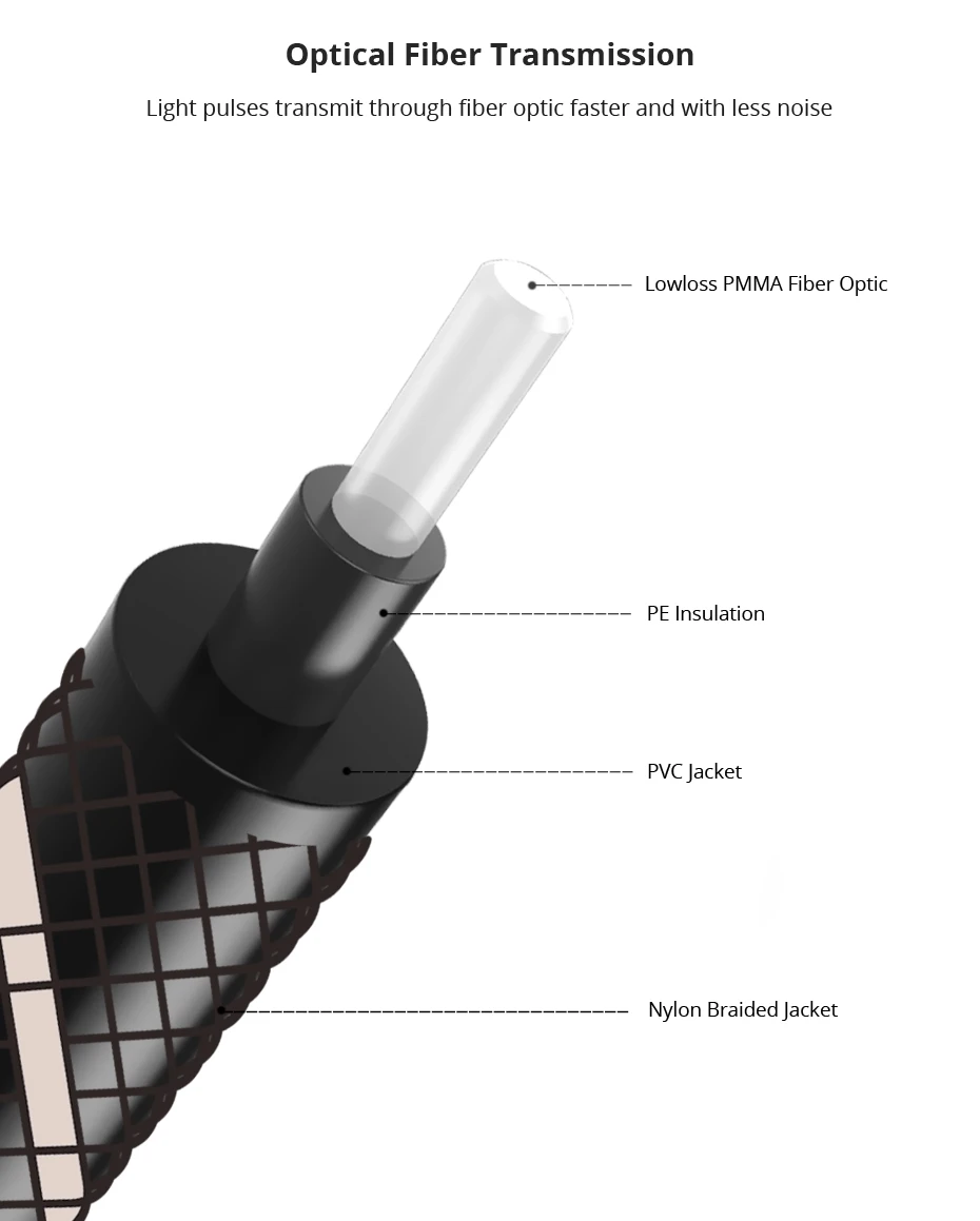 2. Núcleos POF de baja pérdida ( 0,2dB/M), claro, multicanal, entrada/salida de audio digital de fibra óptica a través de un cable ligero y flexible
