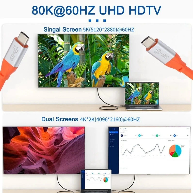 Este cable USB4 permite conectarse desde sus dispositivos equipados con puerto USB4 o Thunderbolt3/4 a sus monitores USB-C. Admite un solo 8K@60hz, 5K@60Hz o 4K@60Hz máx.Resolución de vídeo en tus pantallas externas.(Asegúrese de que el puerto tipo c de su monitor admita el modo alternativo DP para video).