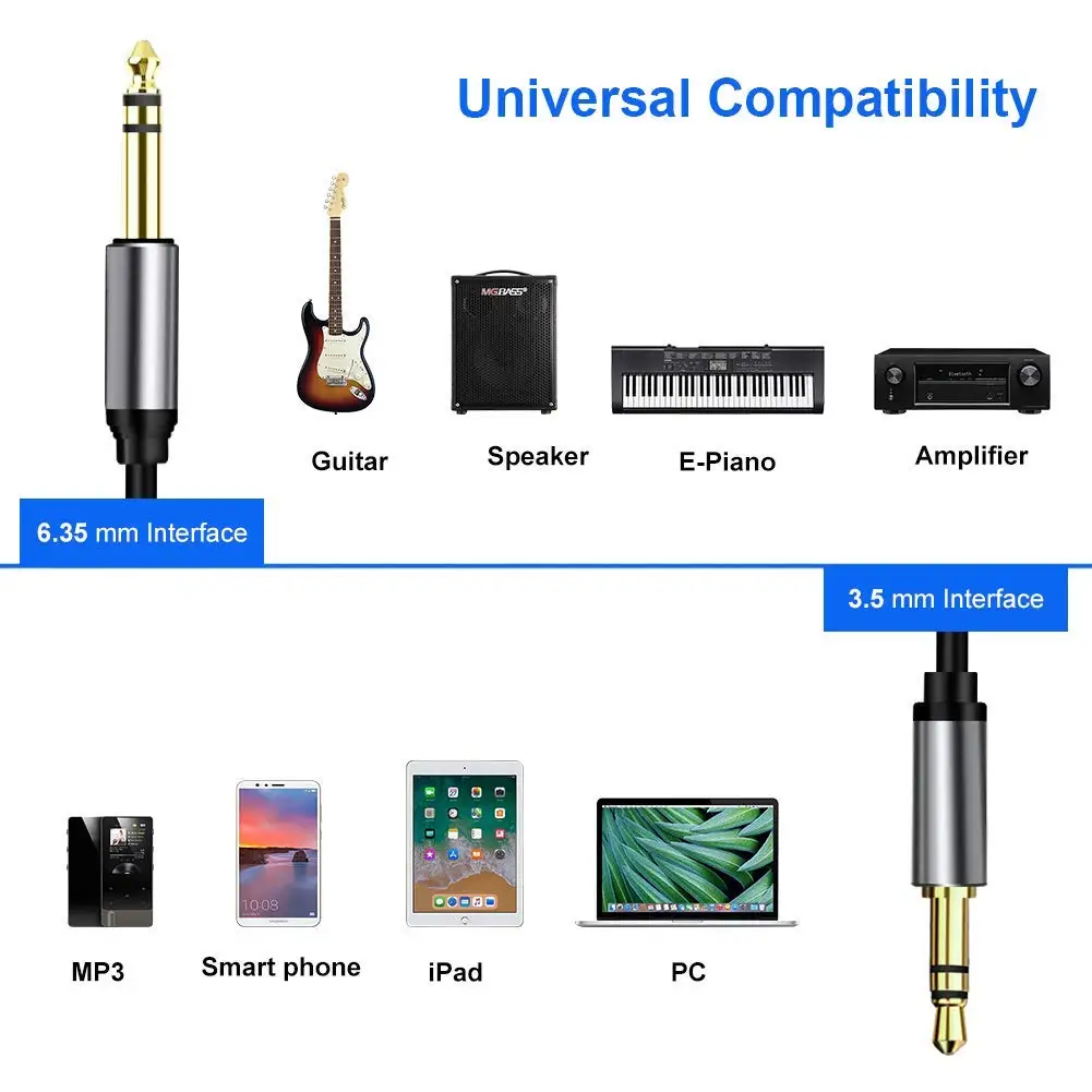 4. Wide compatibility: the 6.35 mm jack plug of this 1/4 to 3.5mm cable fits all devices with a 6.35 mm jack socket, compatible with the Yamaha keyboard, Casio keyboard, Roland keyboard, electric keyboard, digital piano, home theatre, speaker, bass amplifier, recorder, mixer, guitar, etc. The 3.5mm end is compatible with all devices with a 3.5mm jack.